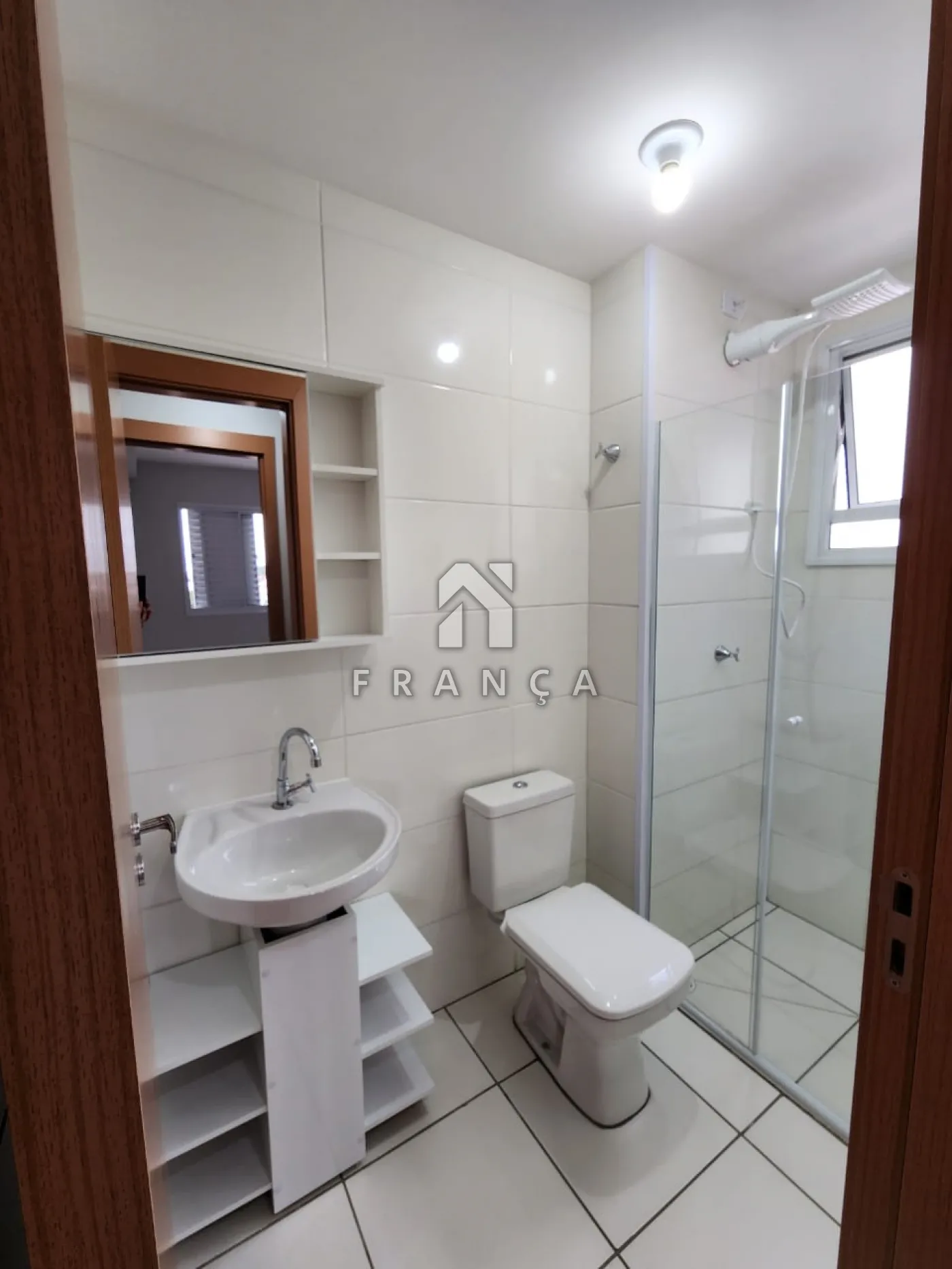 Banheiro completo com armário planejado, box e chuveiro