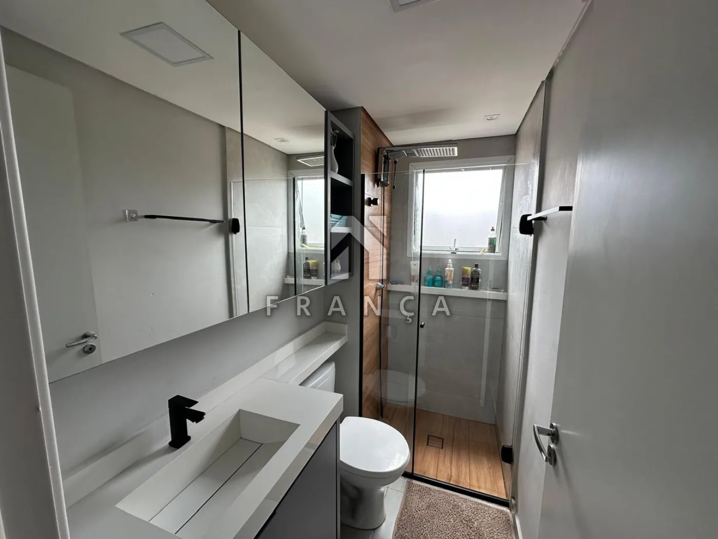 - BANHEIRO INDIVIDUAL EQUIPADO : BOX DE VIDRO, NICHO DE BANHO, VARAL DE TETO, PRATELEIRAS DE VIDRO E LAVATÓRIO COM GABINETE E ESPELHO;