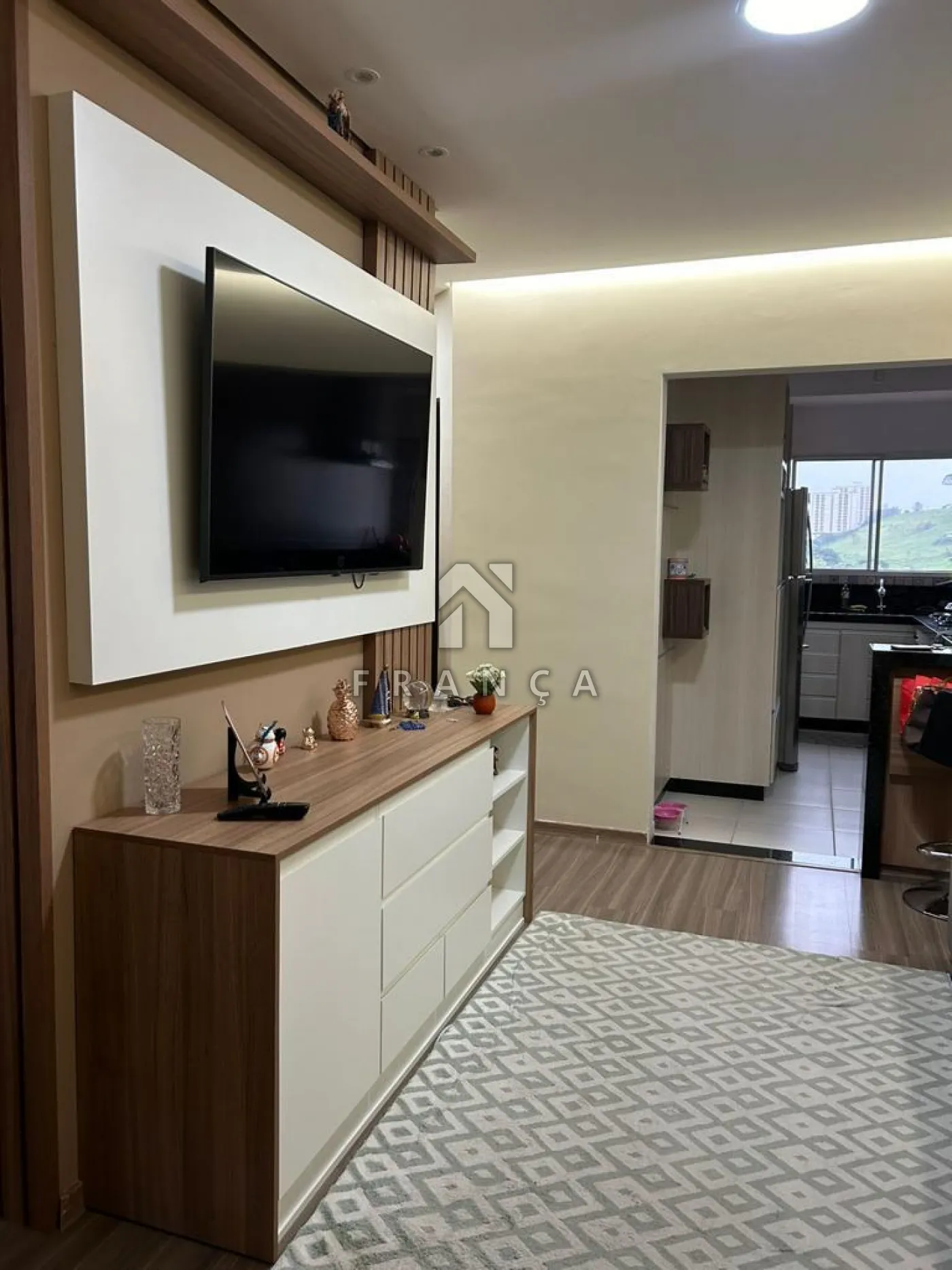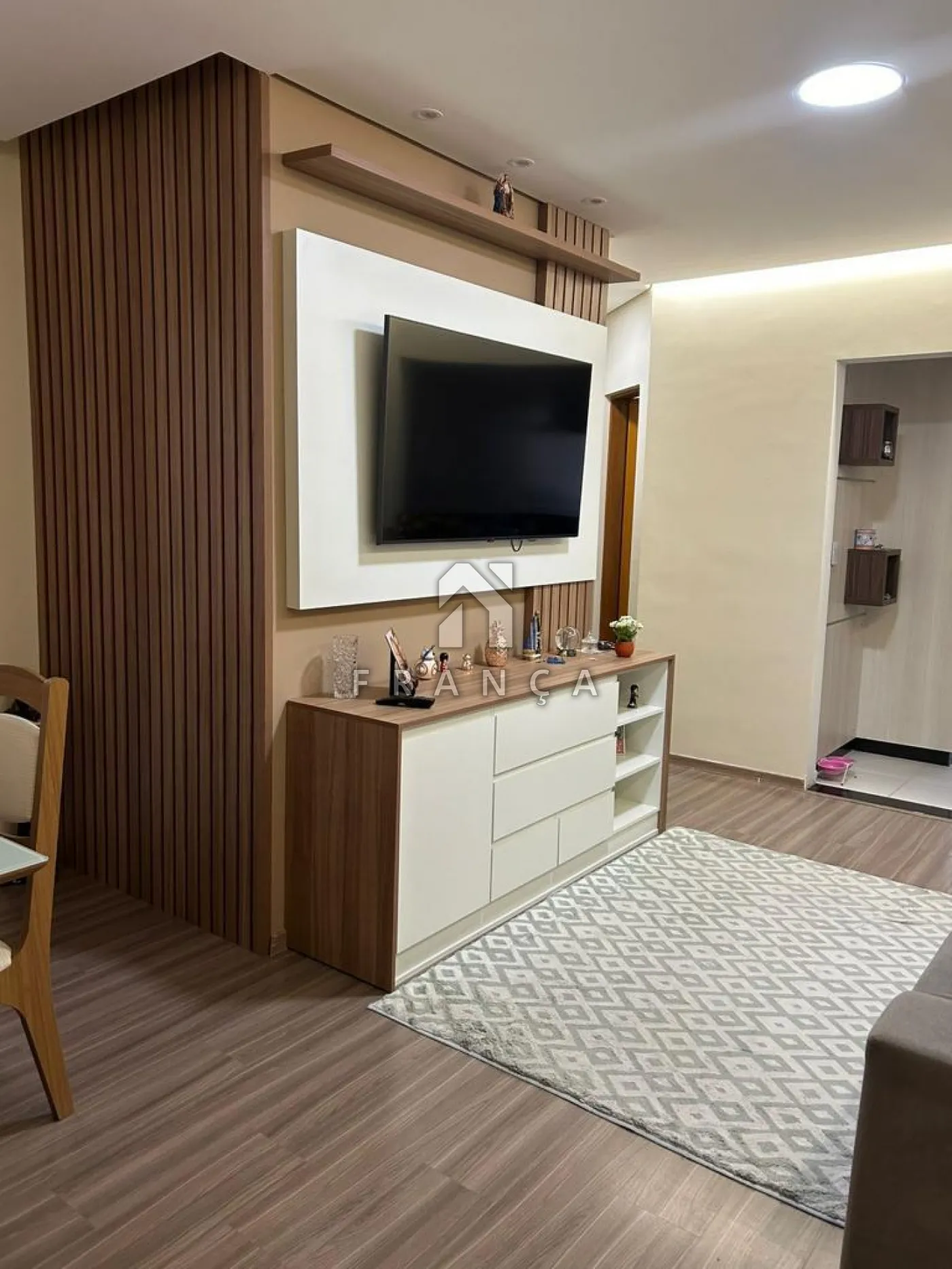 Sala para dois ambientes (jantar e estar) com painel para TV, sanca e iluminação.