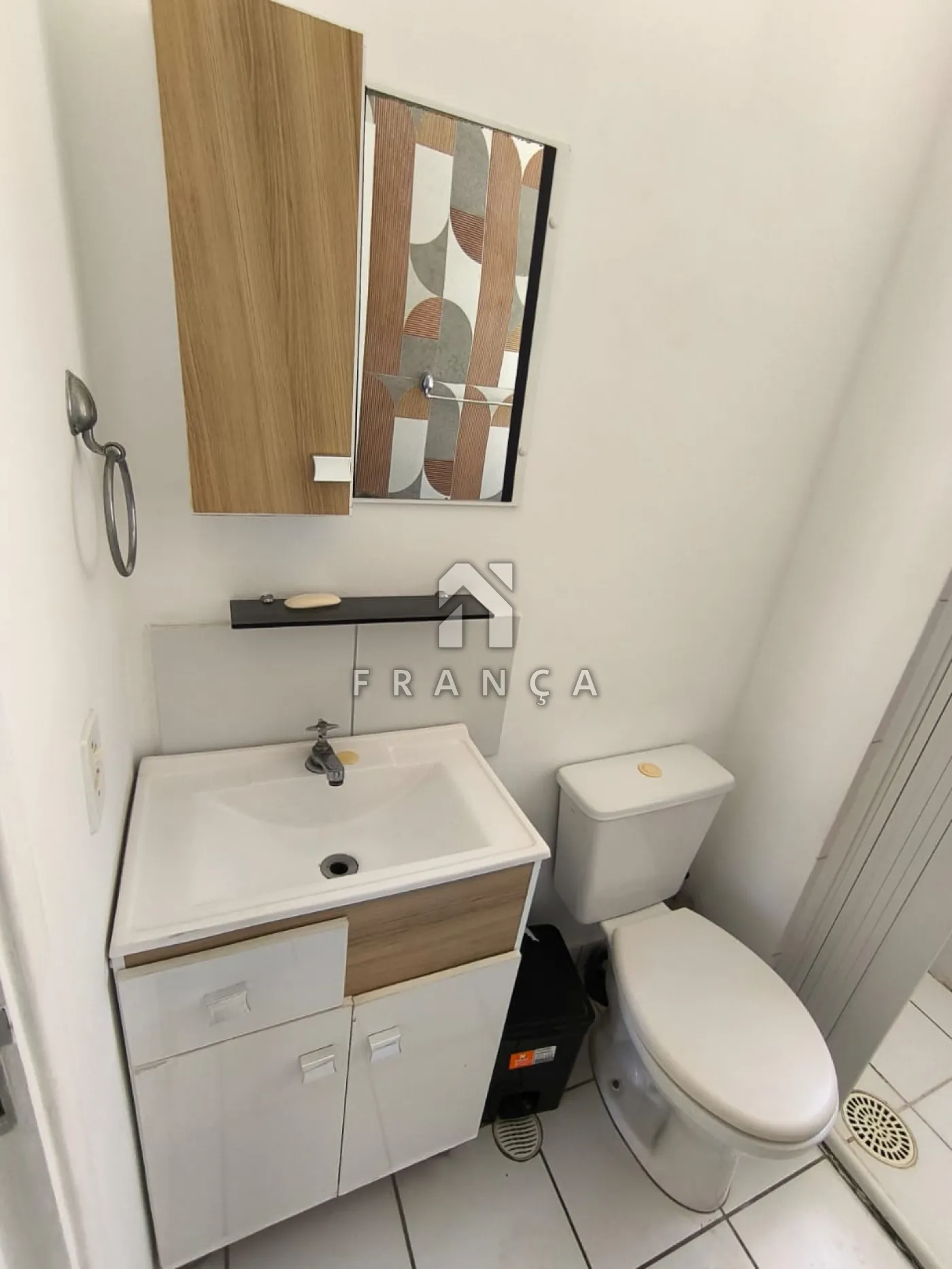 Um banheiro com gabinete planejado