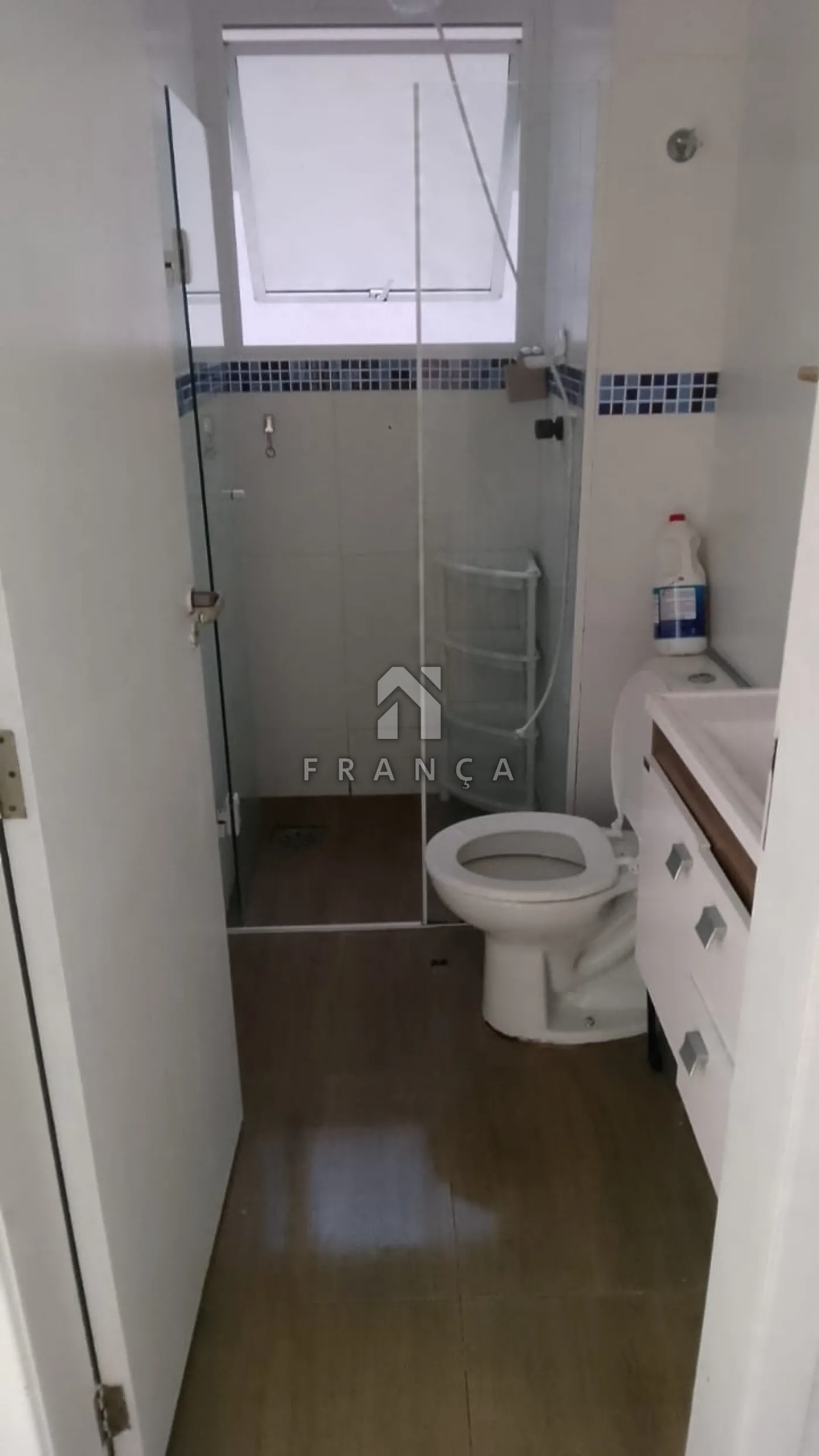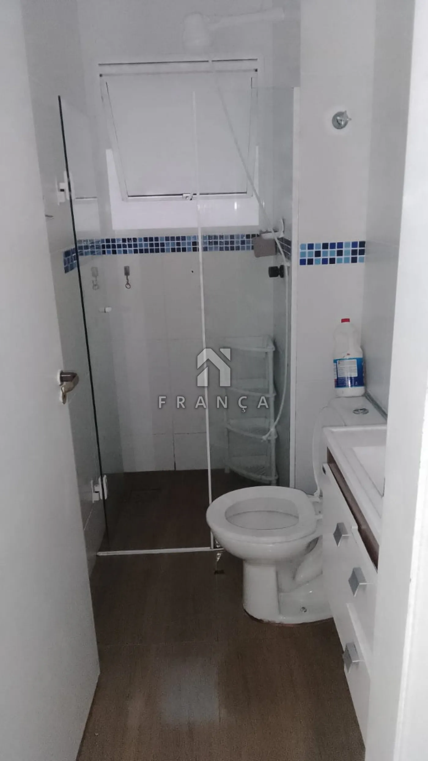 Banheiro com box de vidro e faixa decorativa