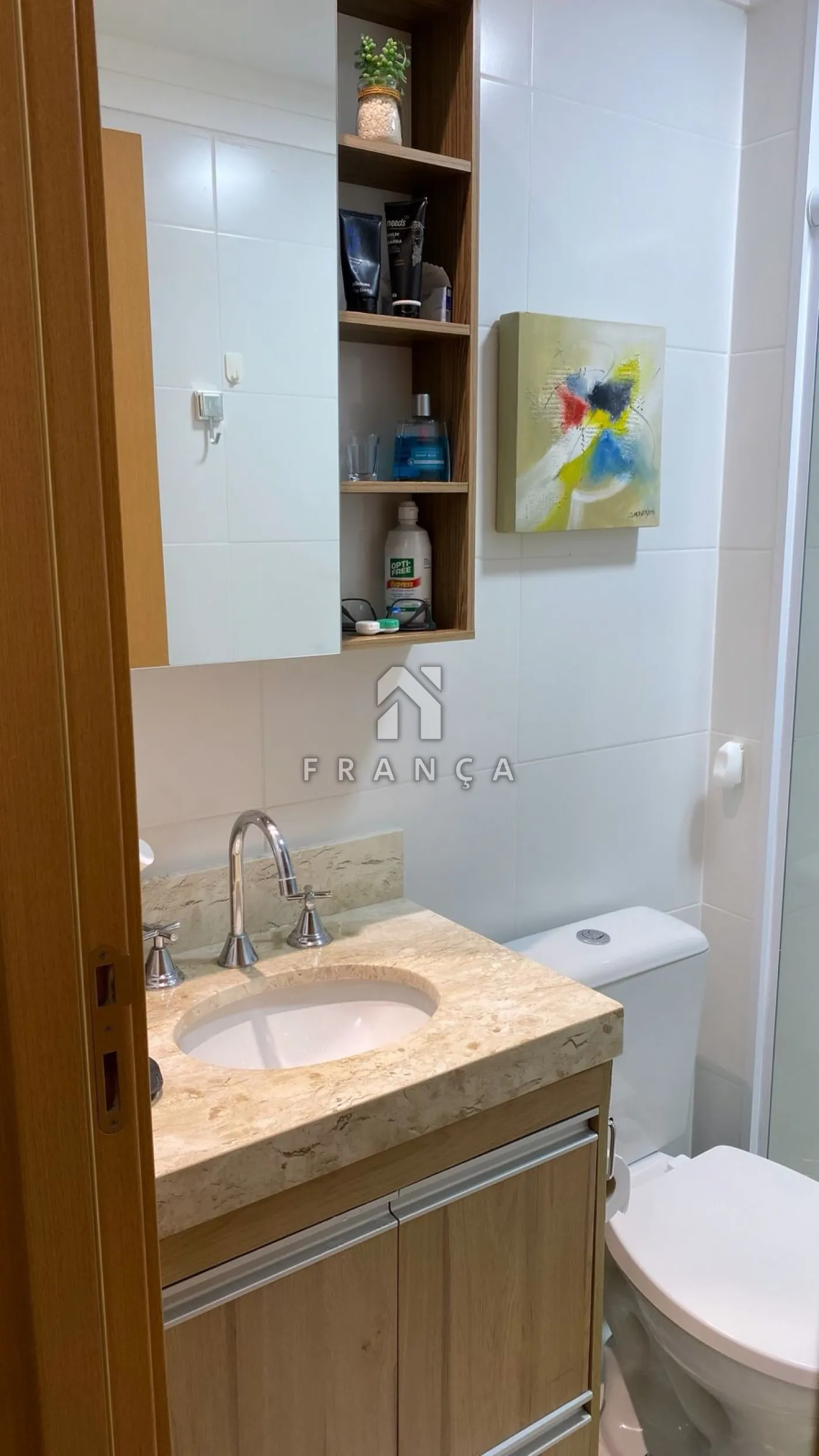 Armários no banheiro e na cozinha