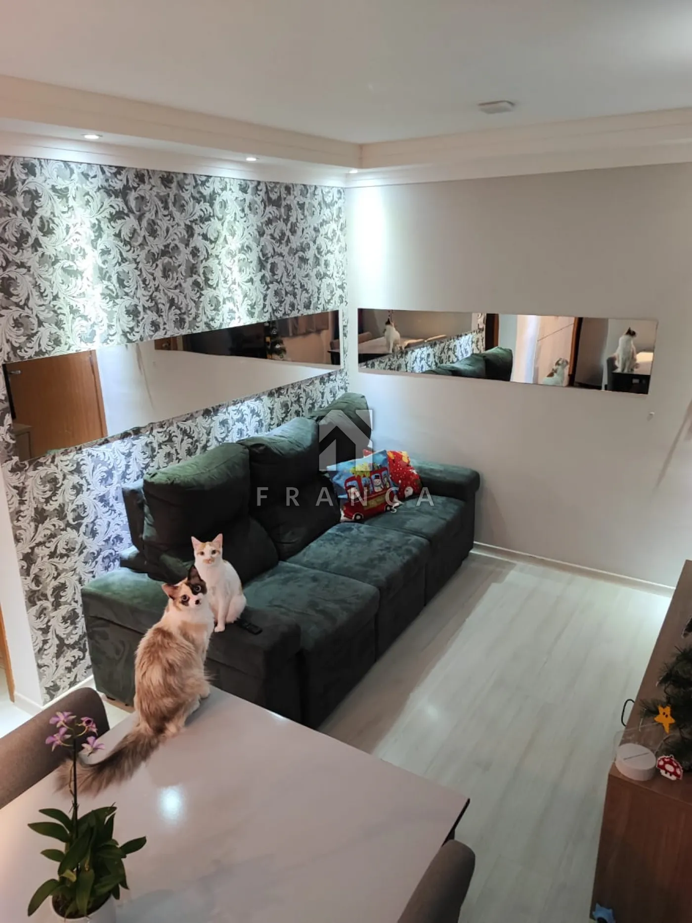Área Social Aconchegante: Sala de estar valorizada por um lindo painel e espelhos.