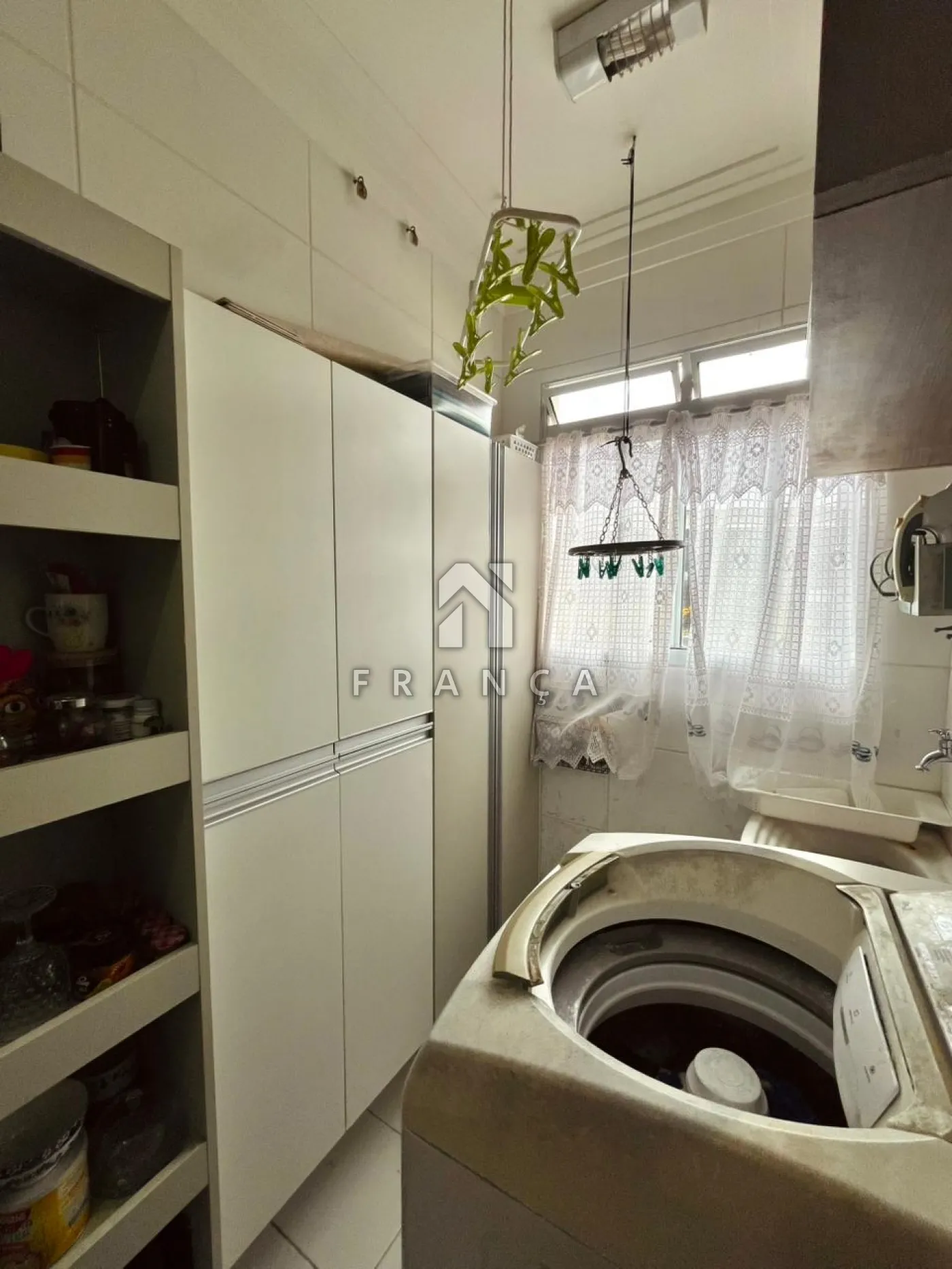 A área social é um destaque à parte: sala de estar e jantar com projeto de iluminação em gesso com sanca, pendentes e cortineiro, criando um ambiente moderno e aconchegante. A cozinha integrada com a lavanderia possui excelente iluminação natural e móveis planejados, otimizando o espaço com funcionalidade.
