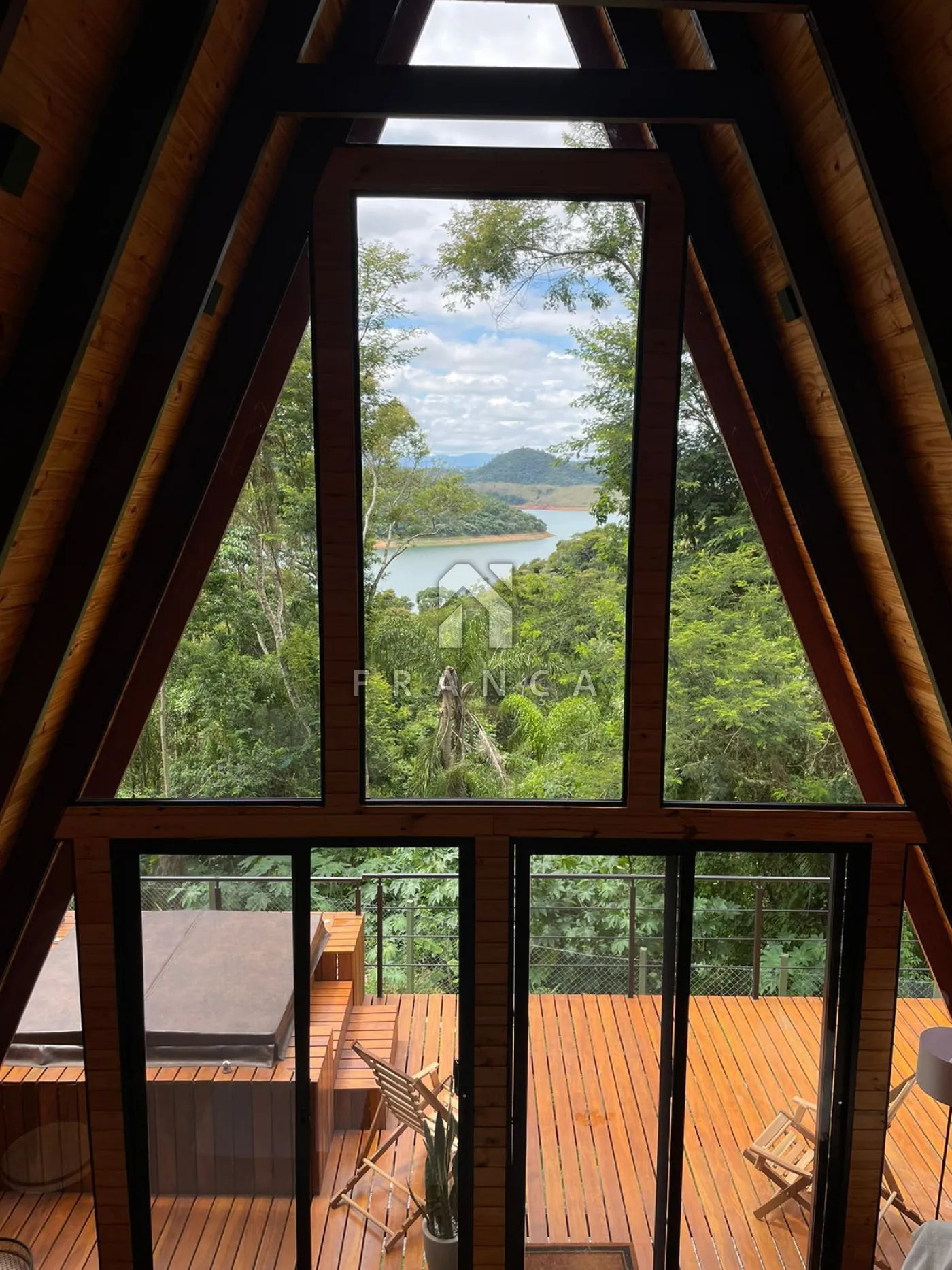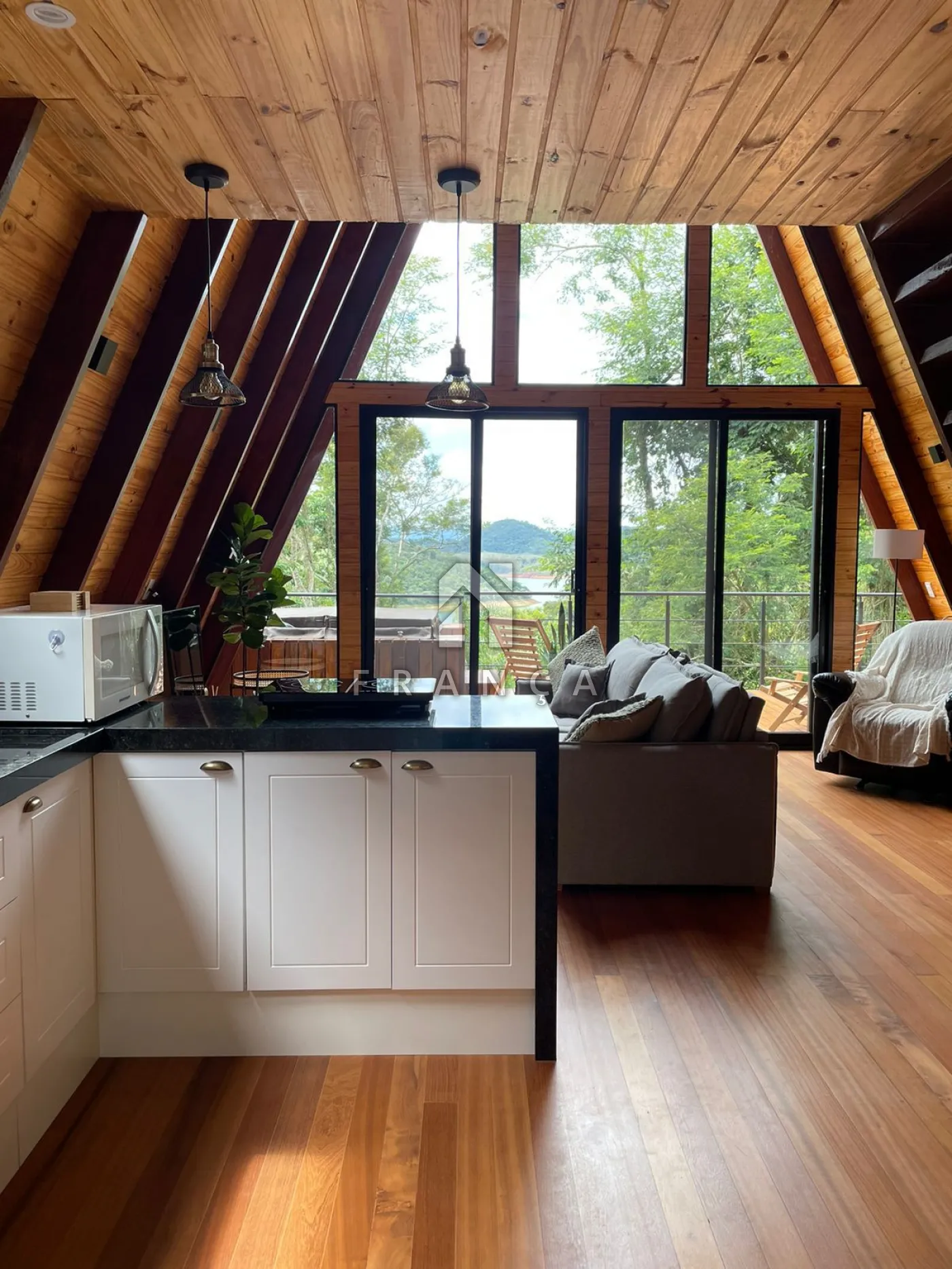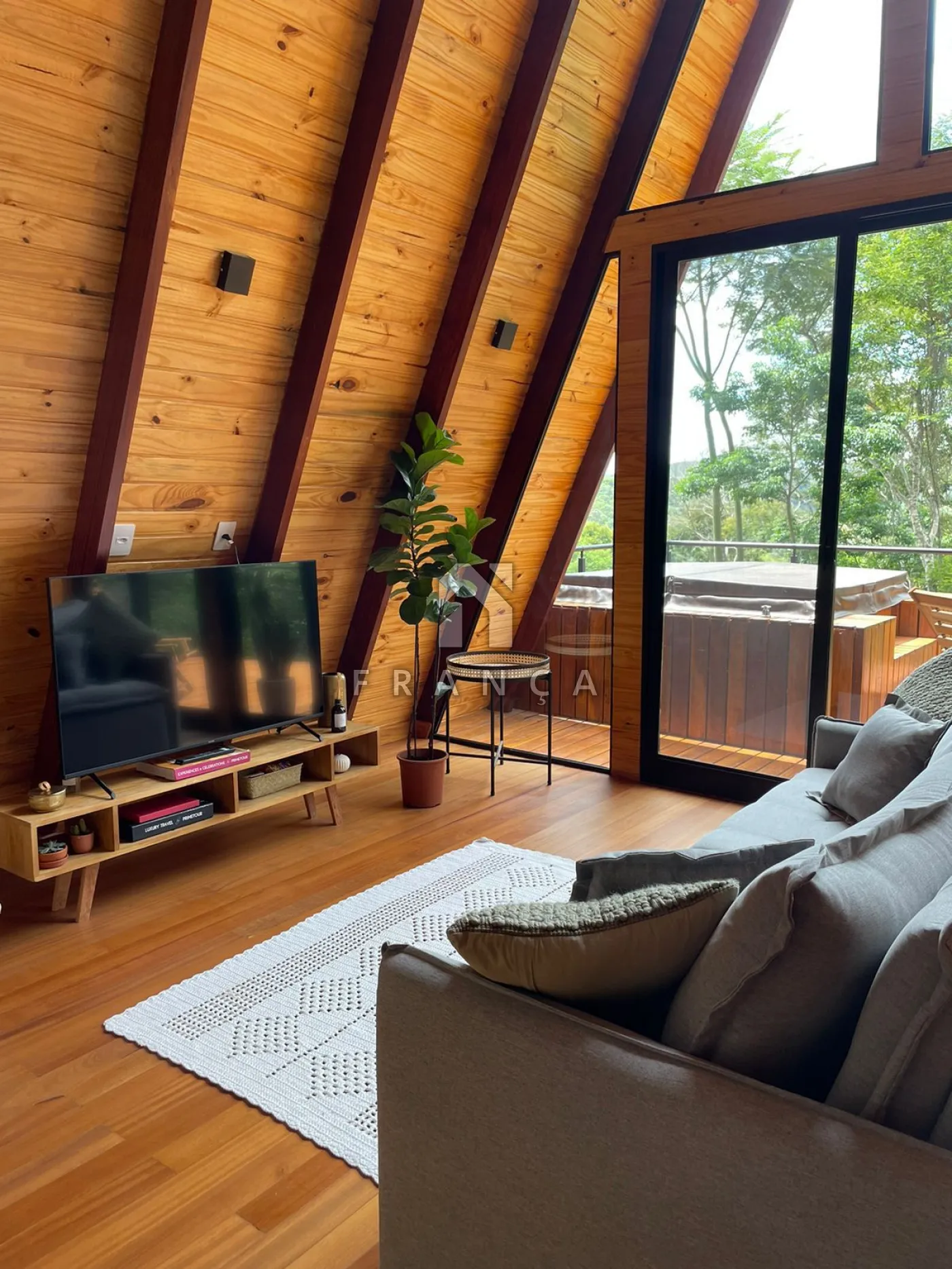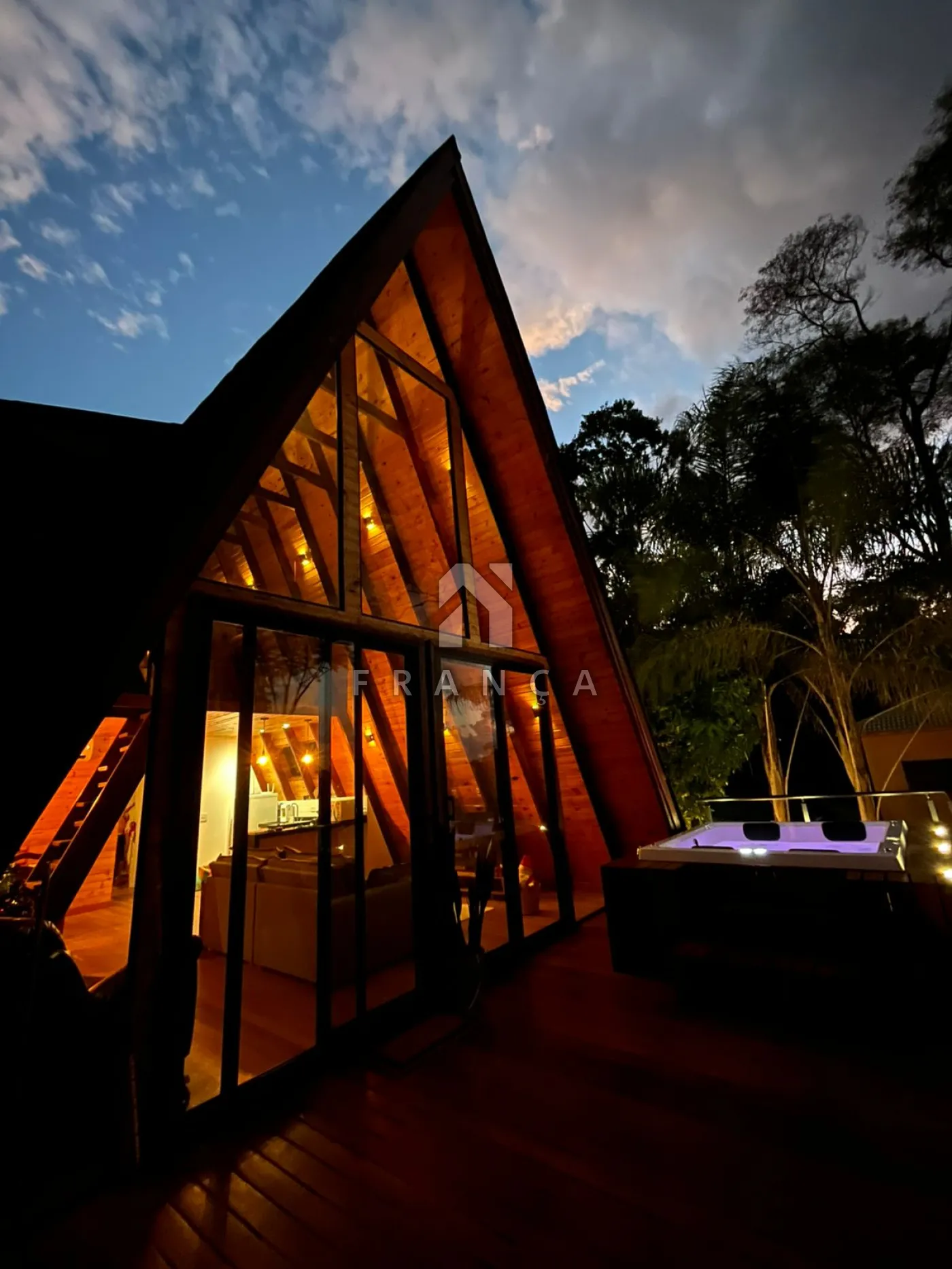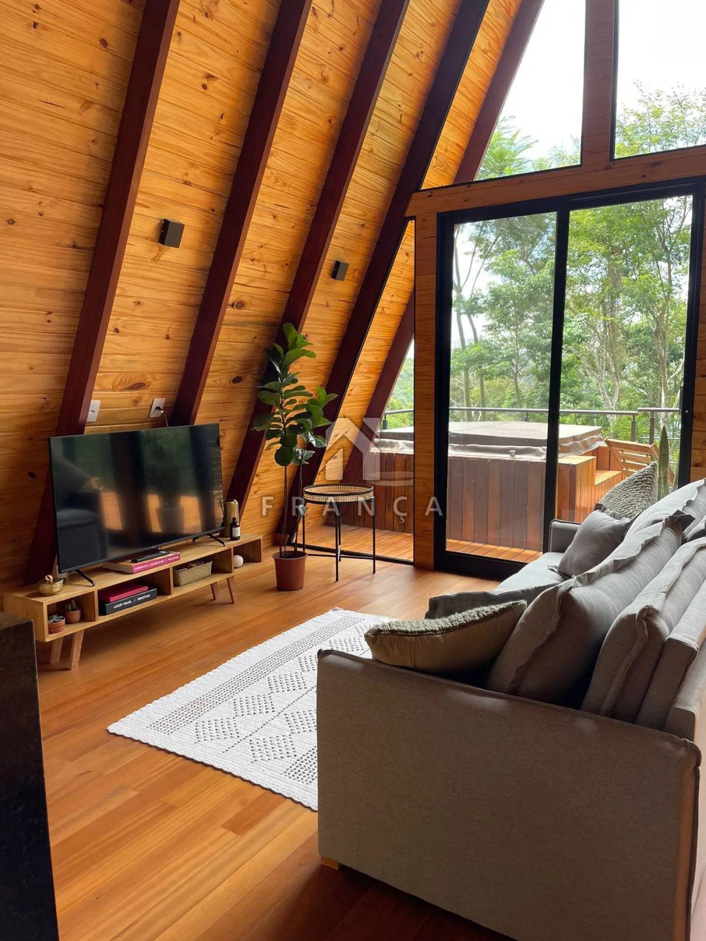 2 quartos, 1 banheiro, sala de TV, sala de jantar, cozinha, espaço de home office, deck com jacuzzi para 4 pessoas, espaço para fogueira e garagem para até 3 carros.