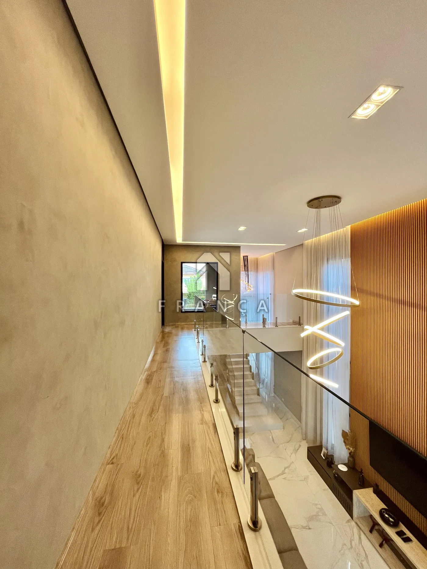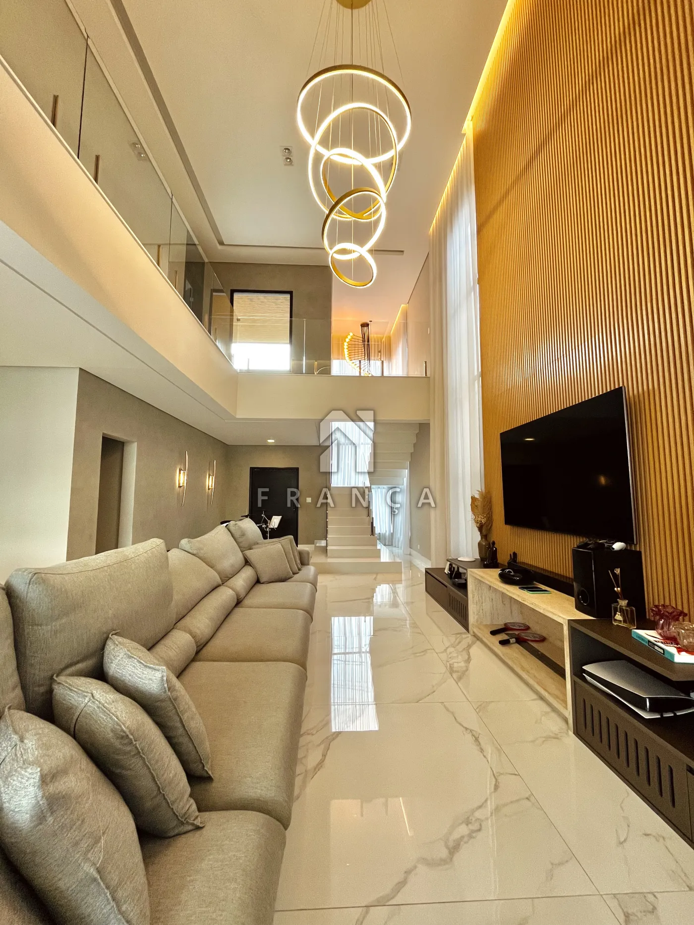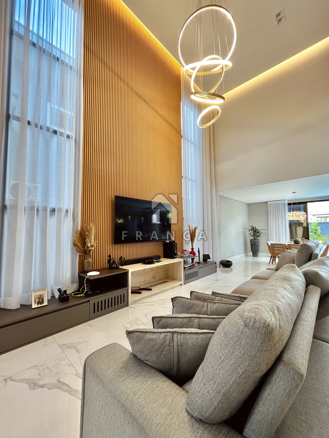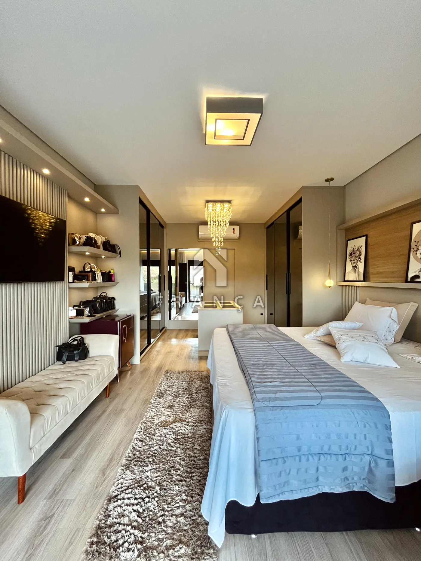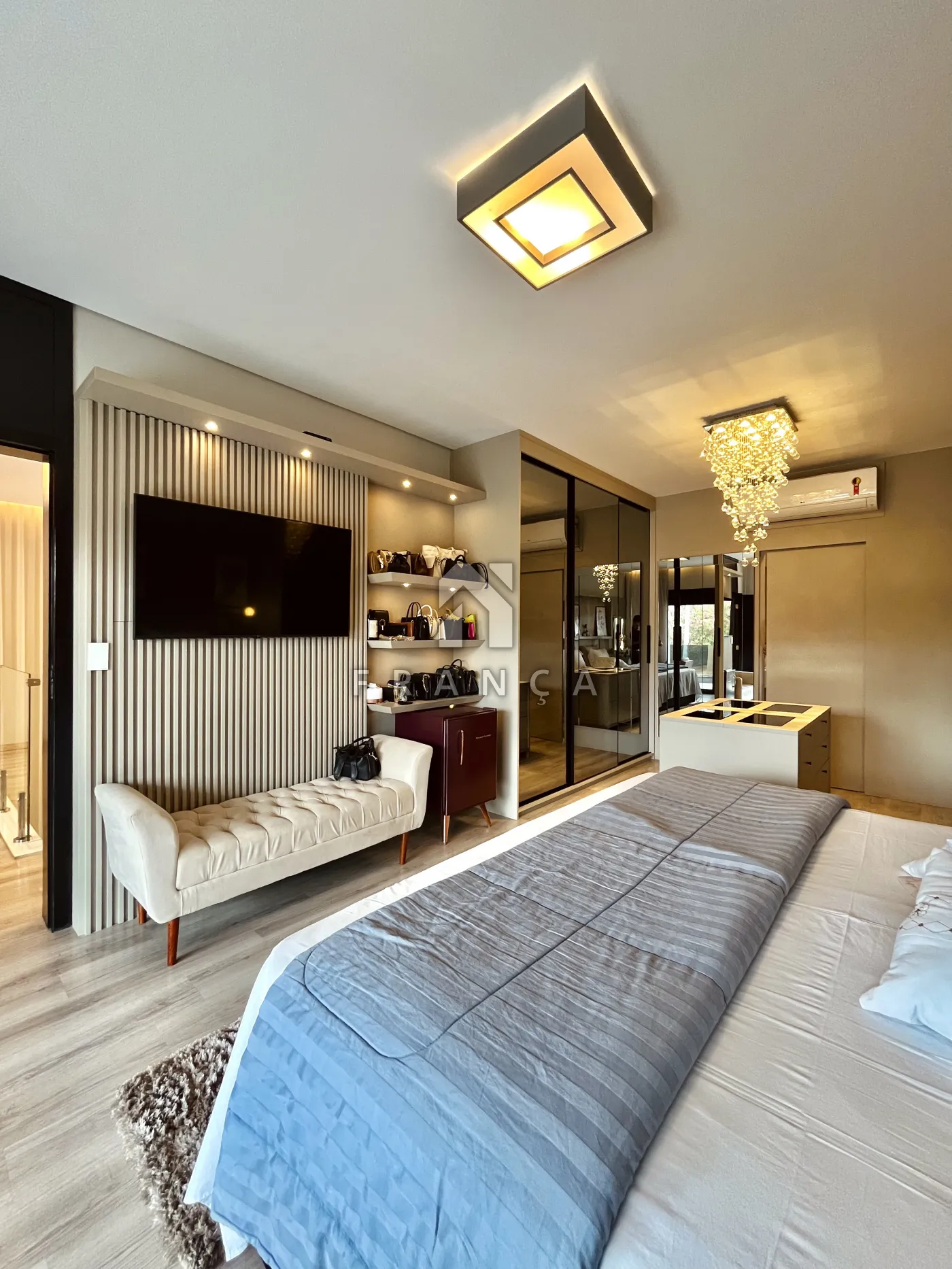 - Sala de TV: Painel planejado exclusivo e lustre central, com lavabo de apoio adjacente.