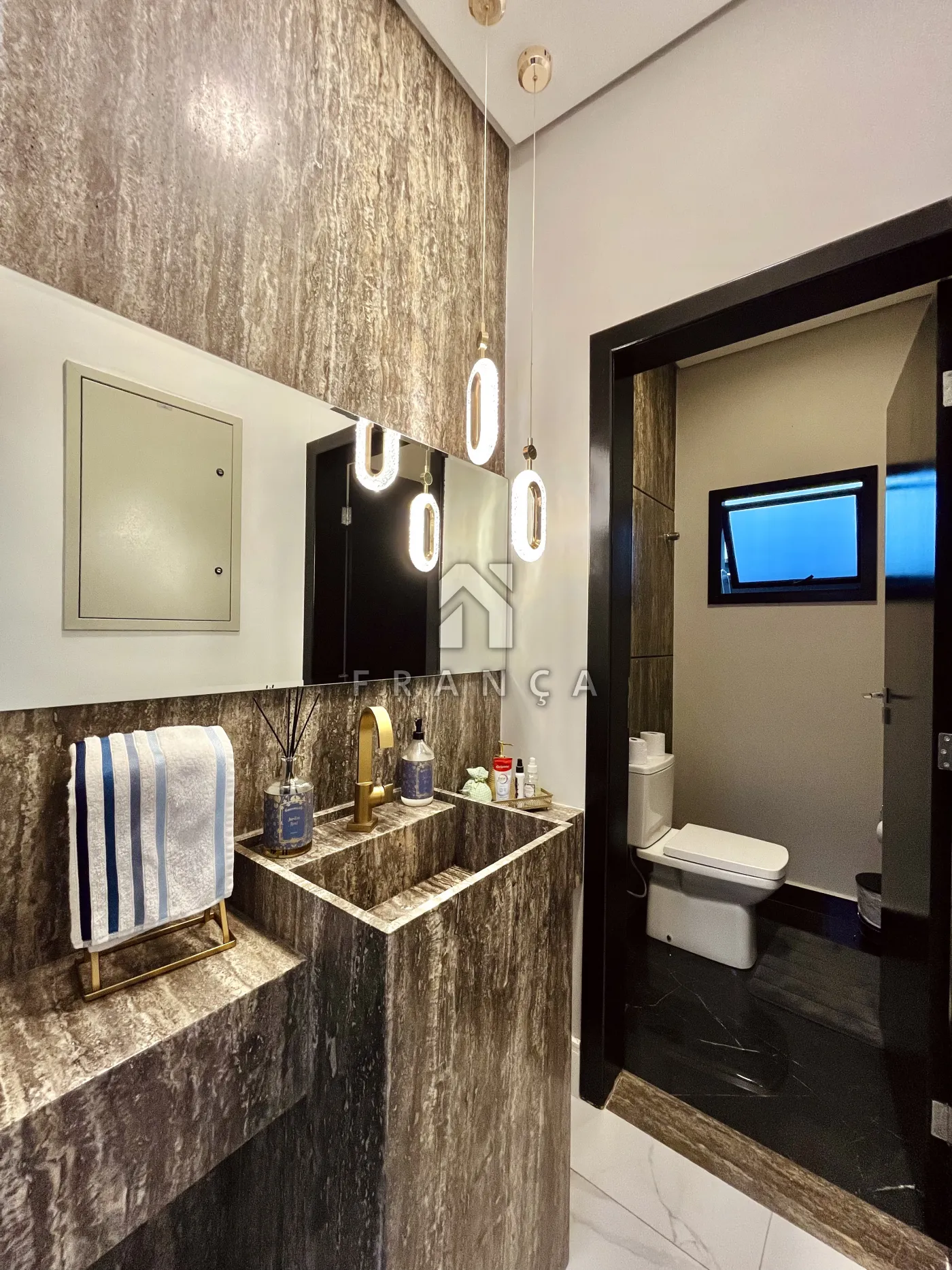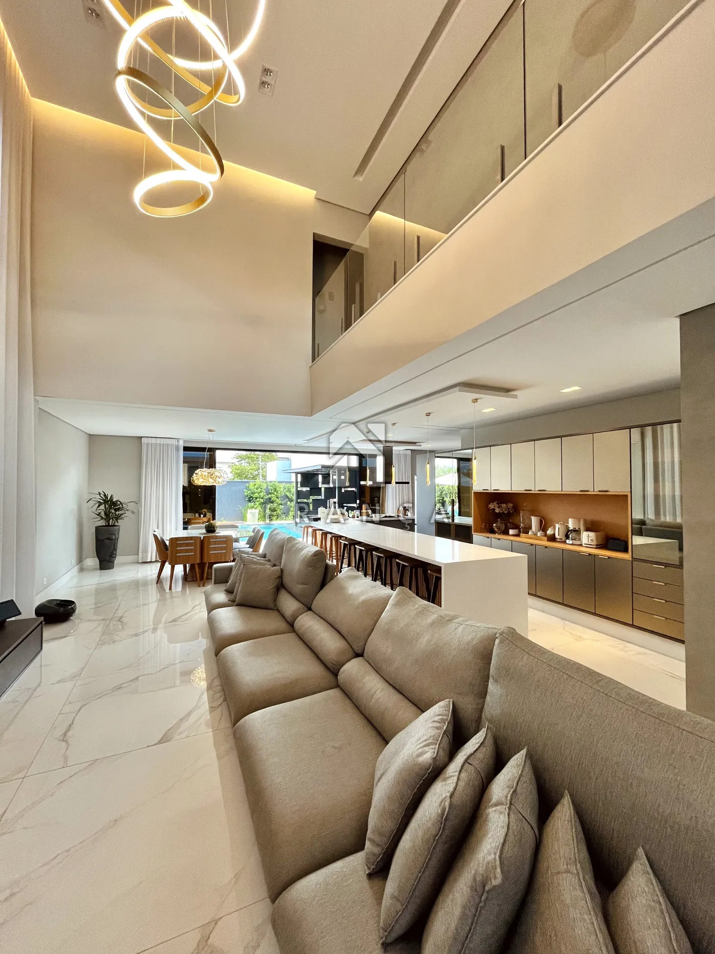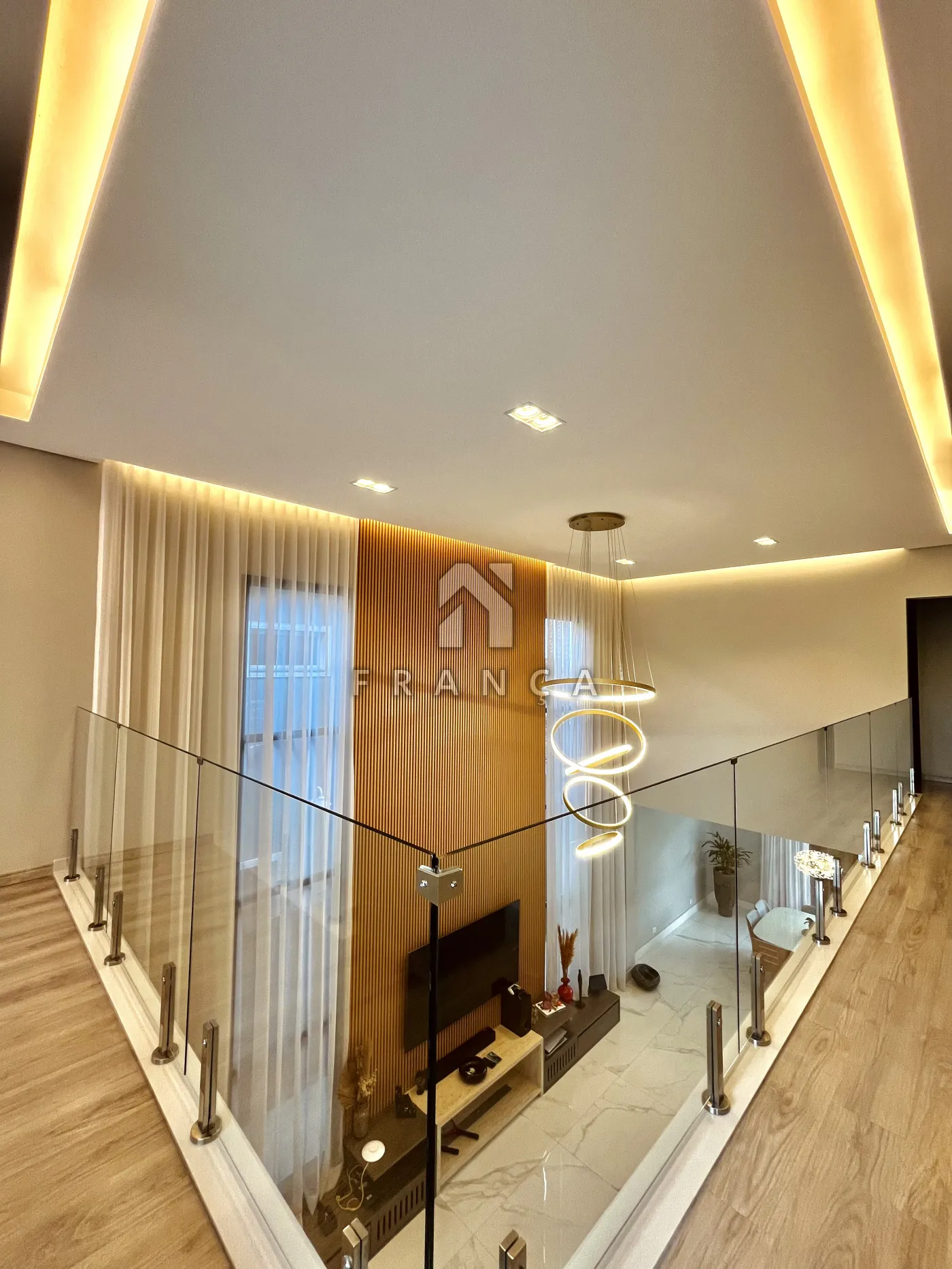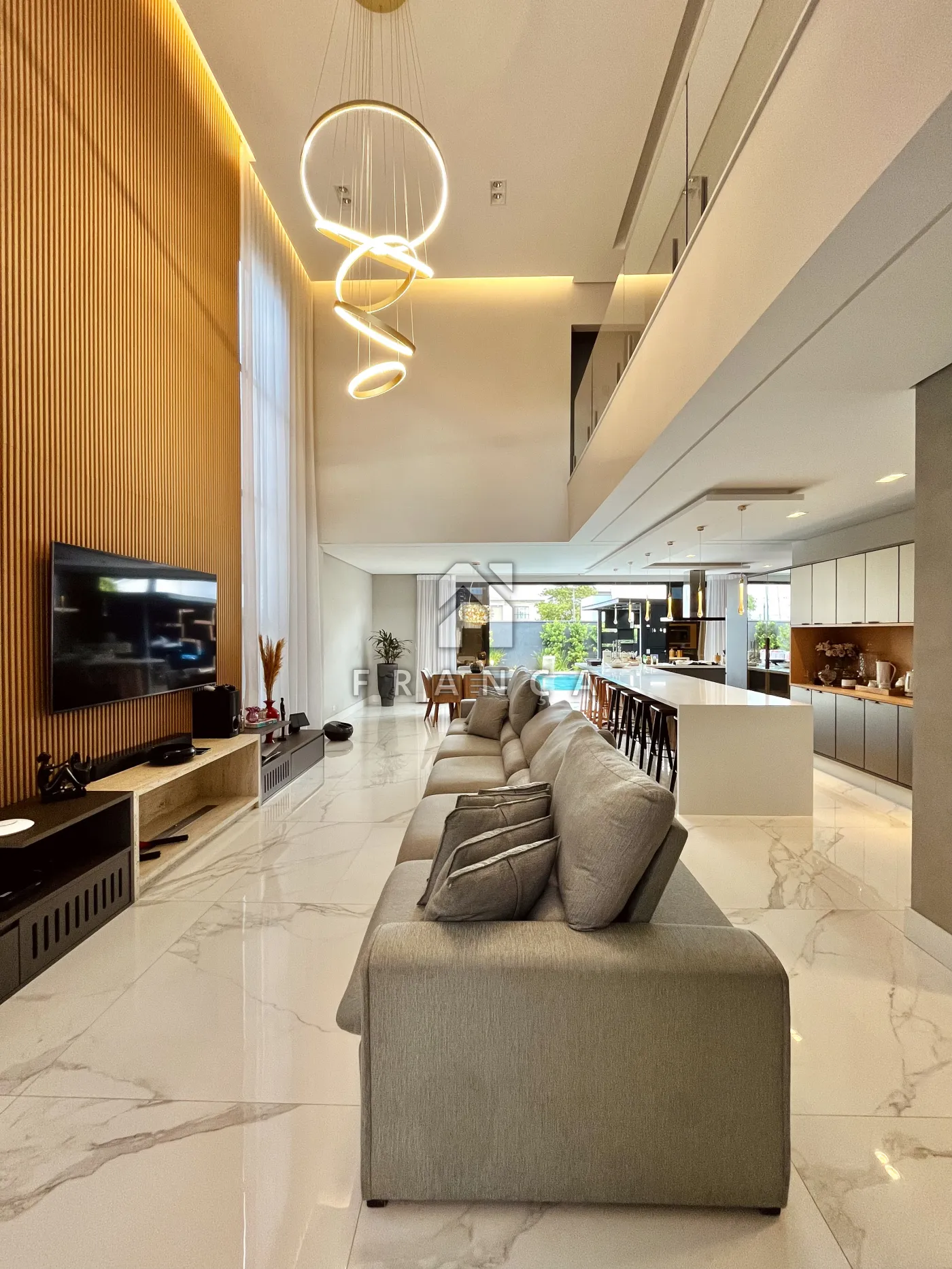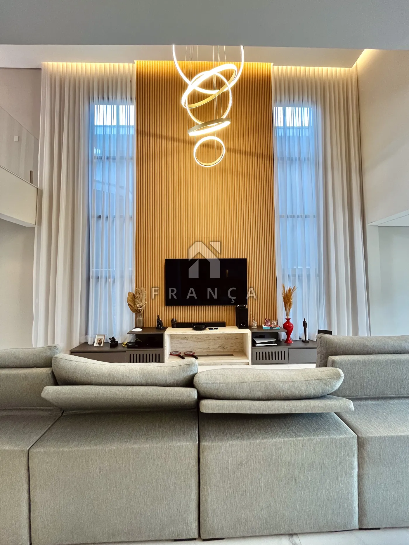 - Sala de TV: Painel planejado exclusivo e lustre central, com lavabo de apoio adjacente.