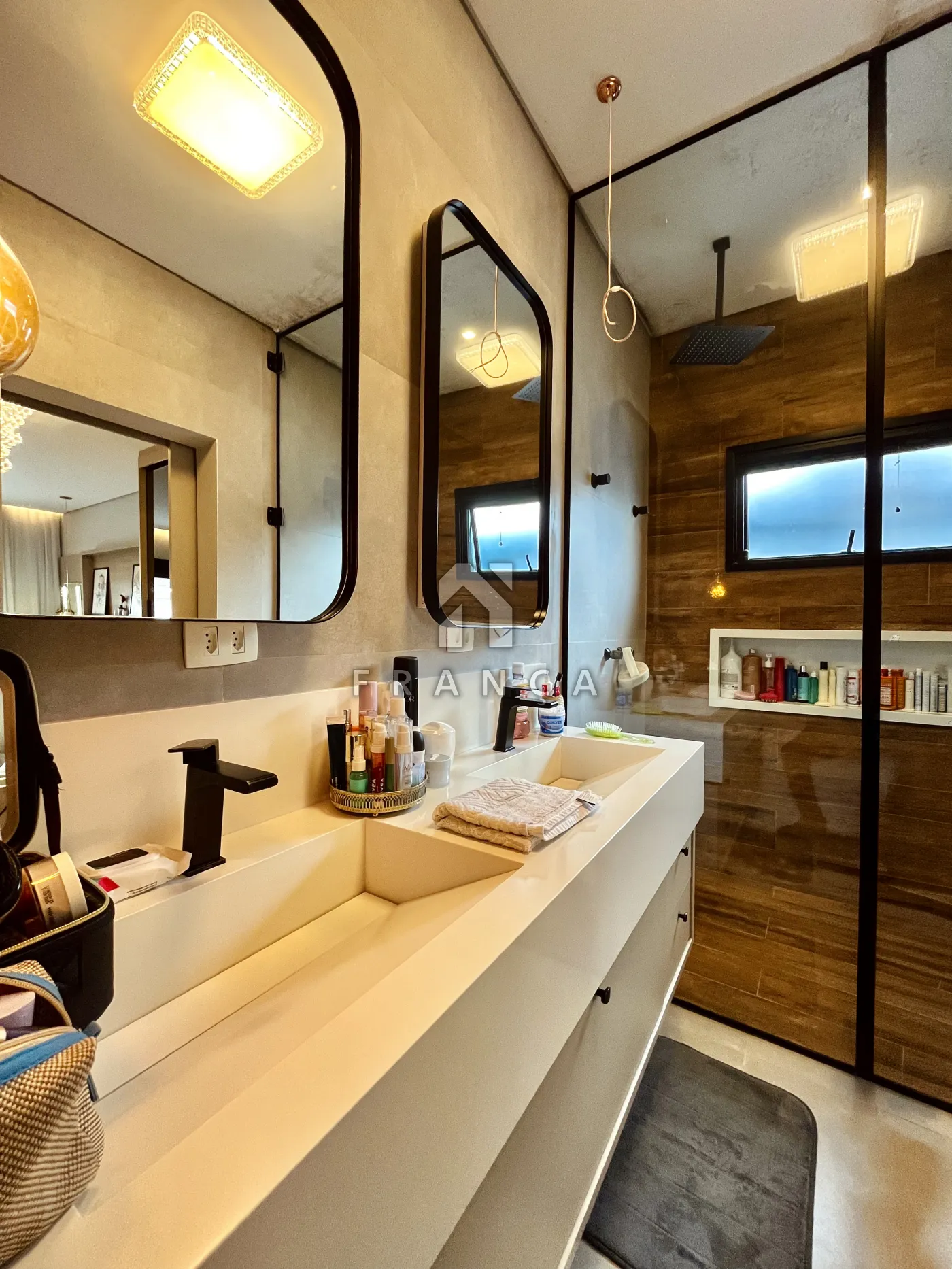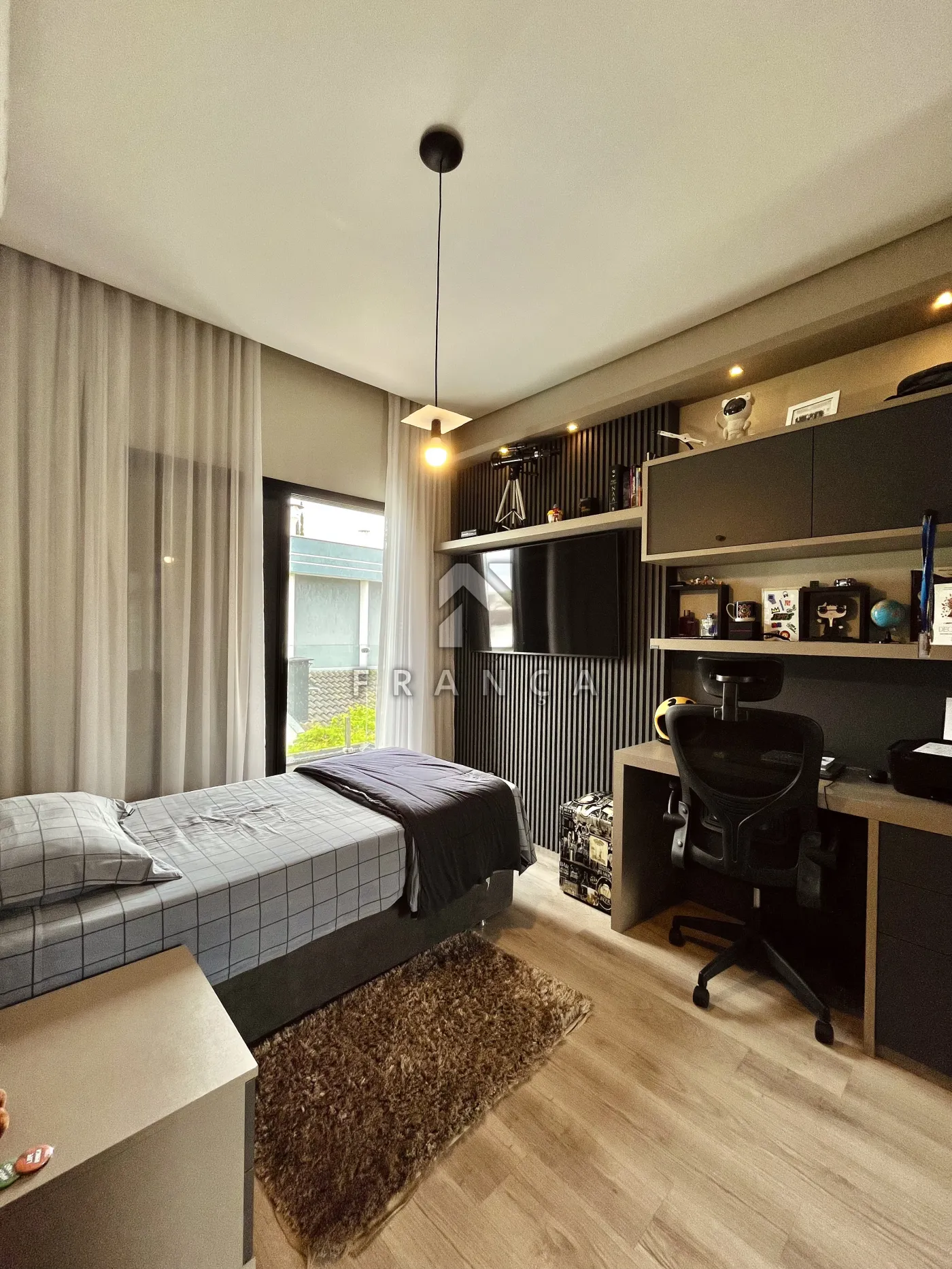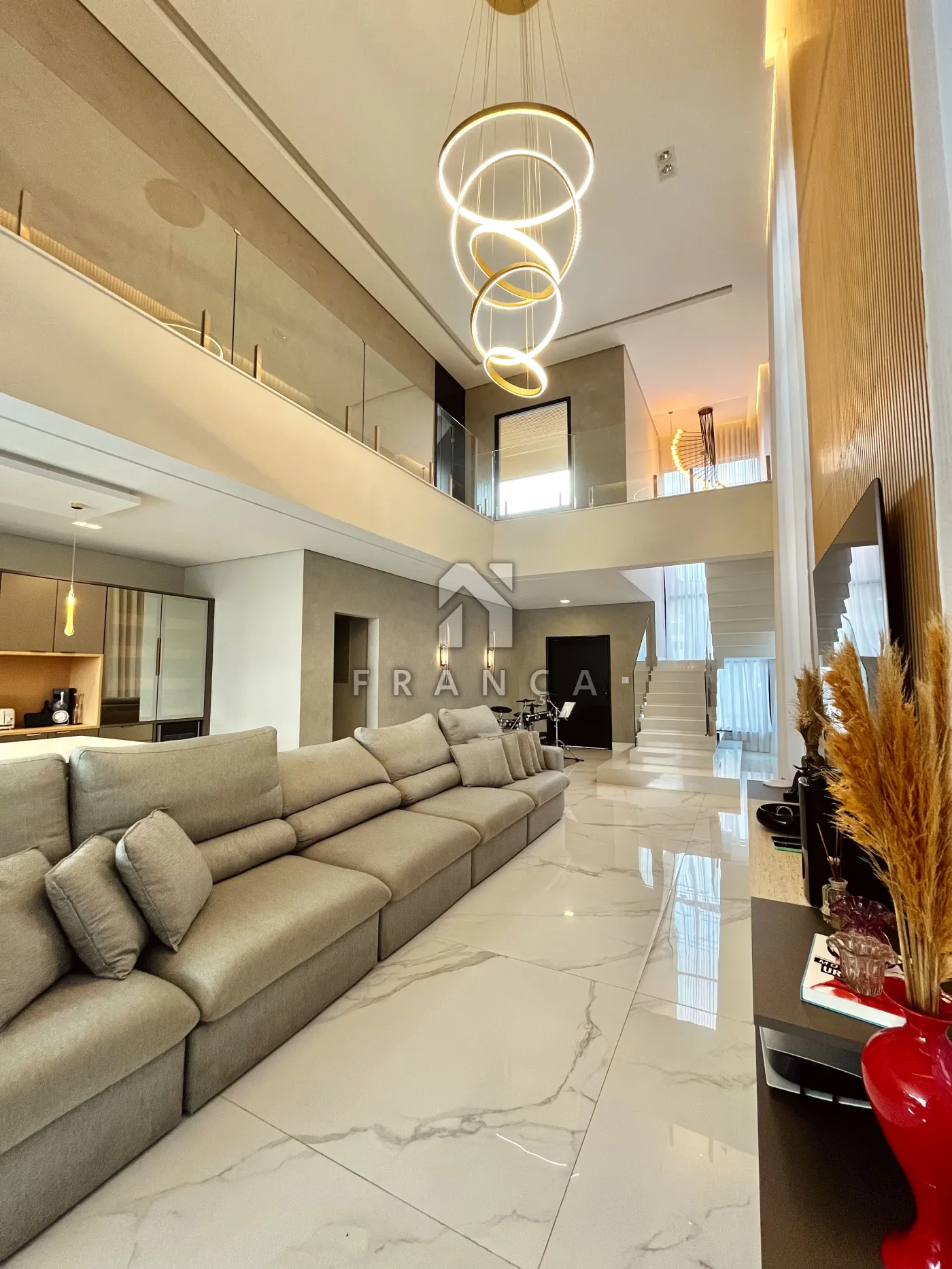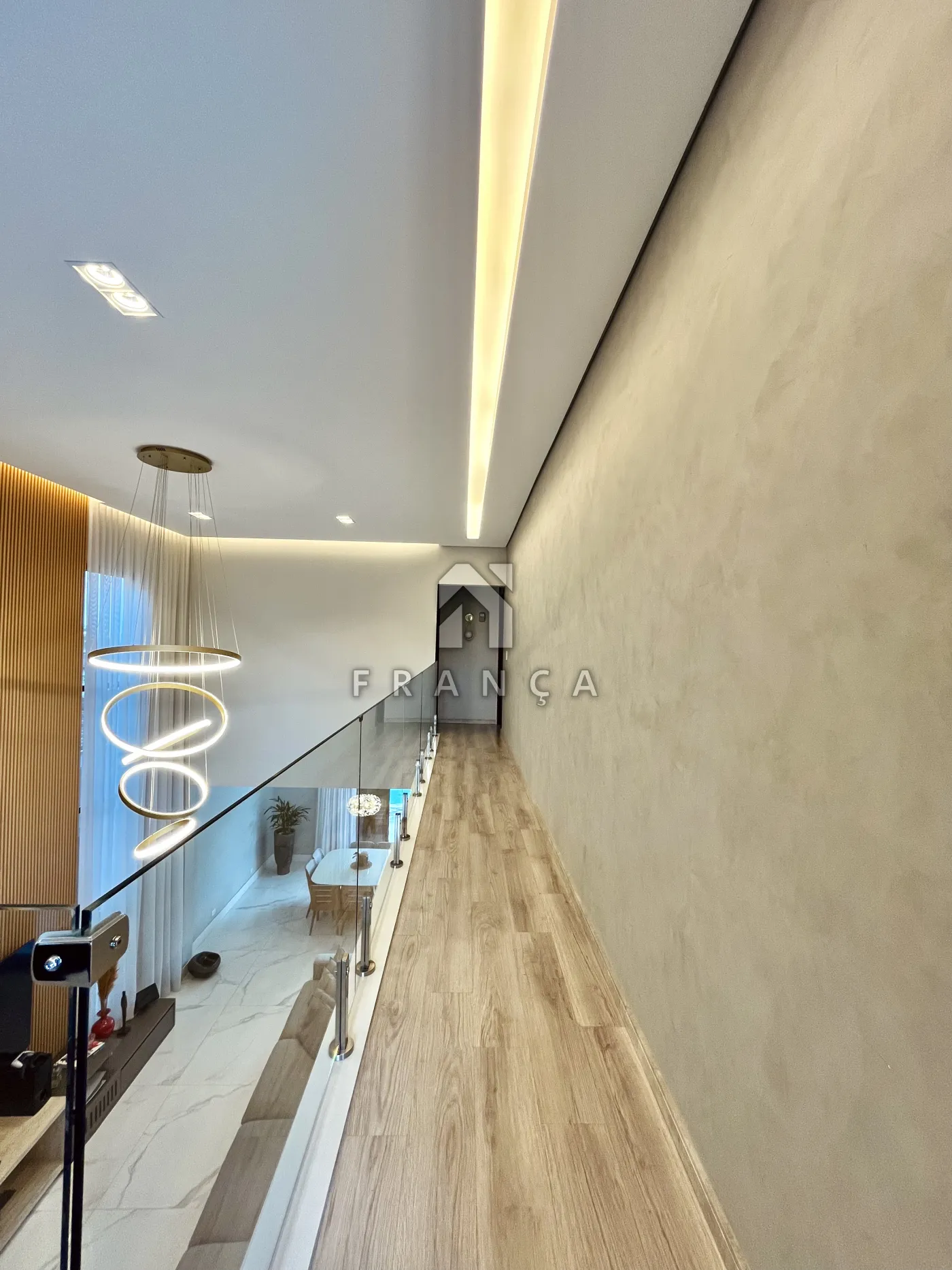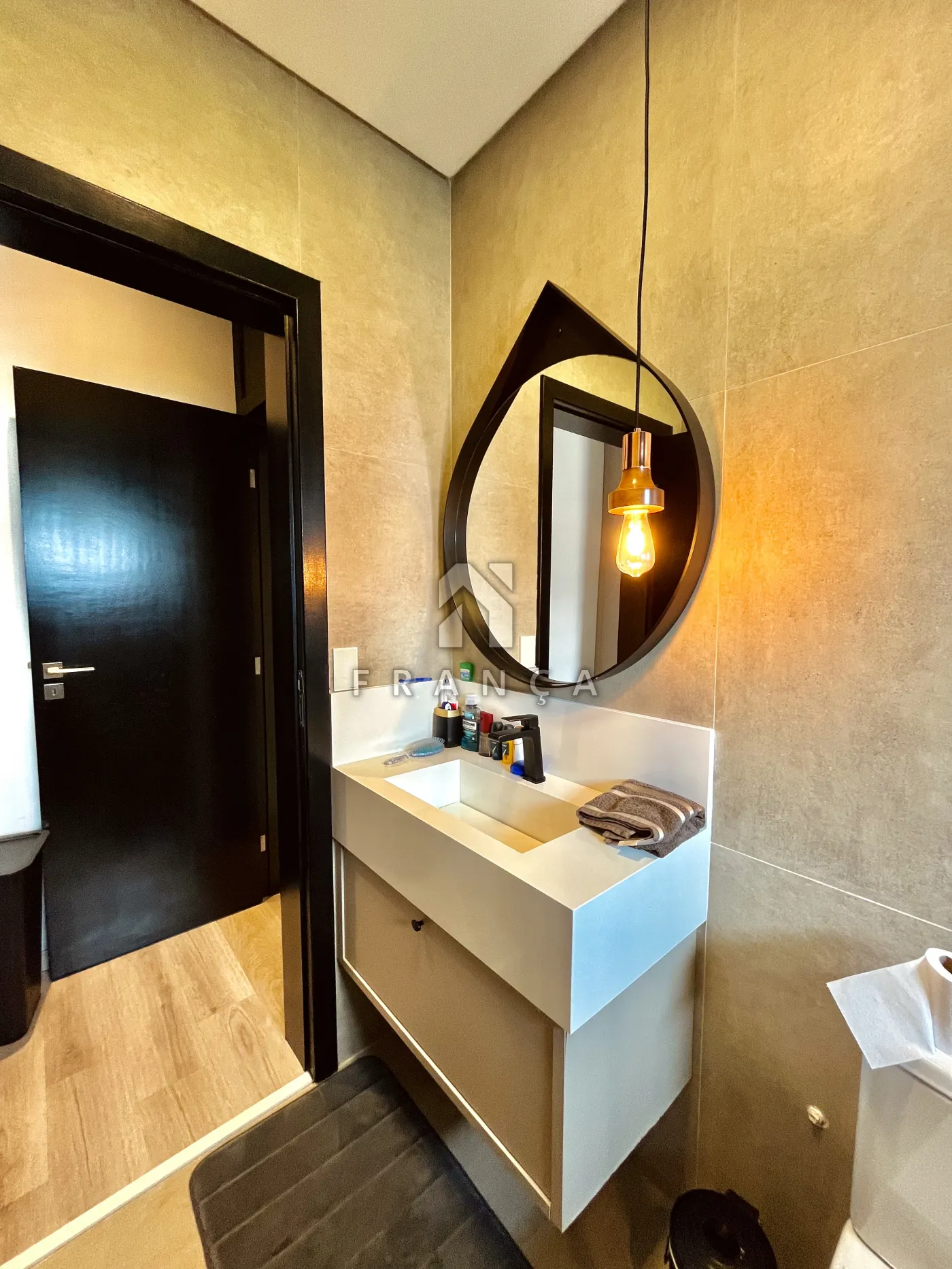 - Sala de TV: Painel planejado exclusivo e lustre central, com lavabo de apoio adjacente.