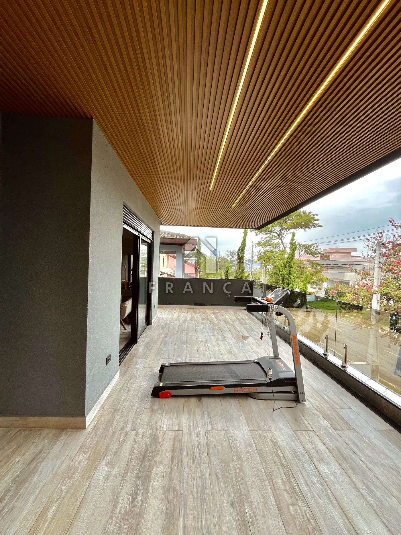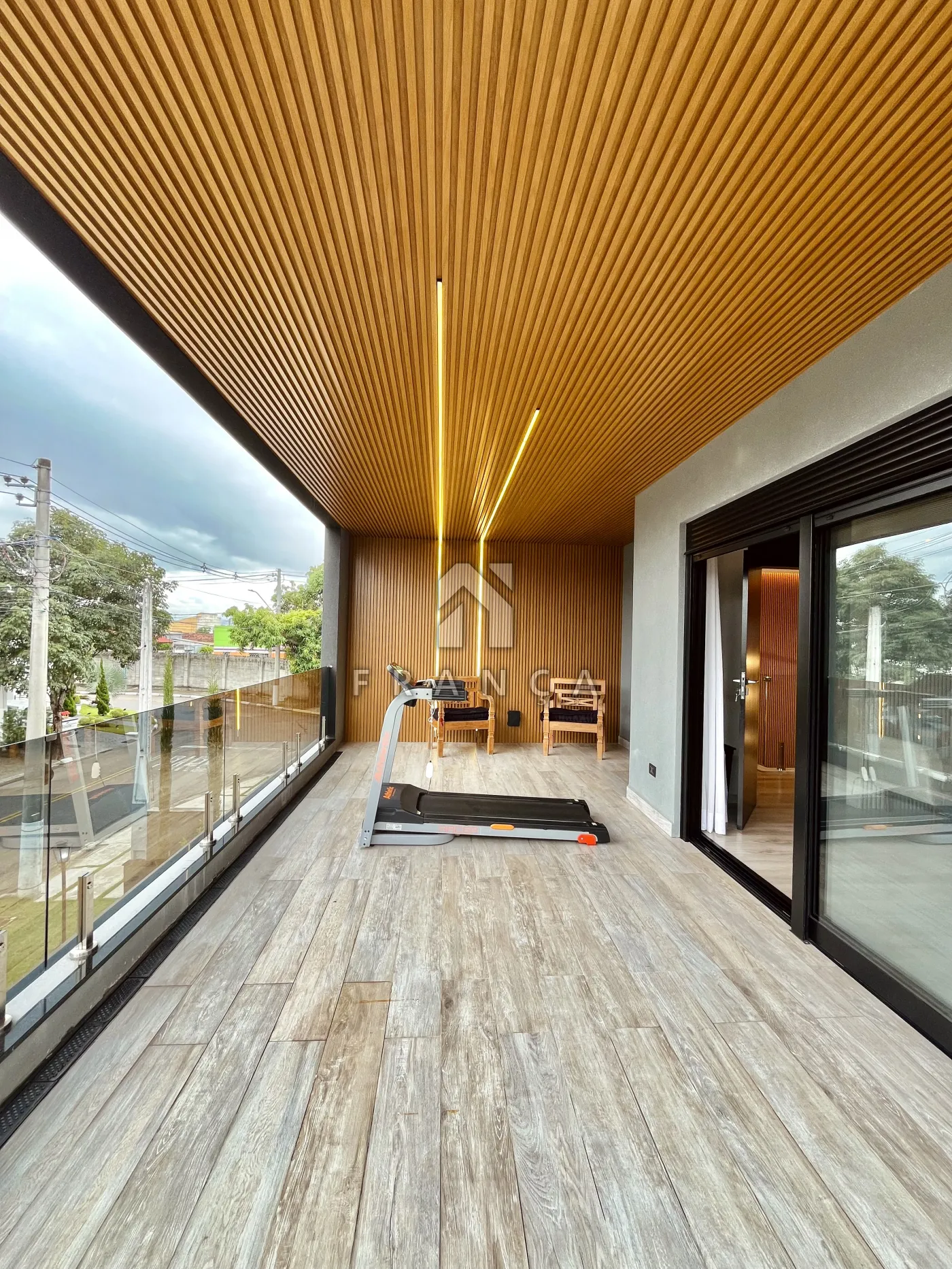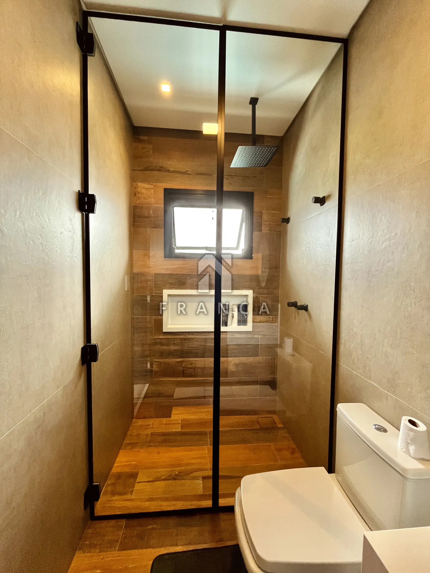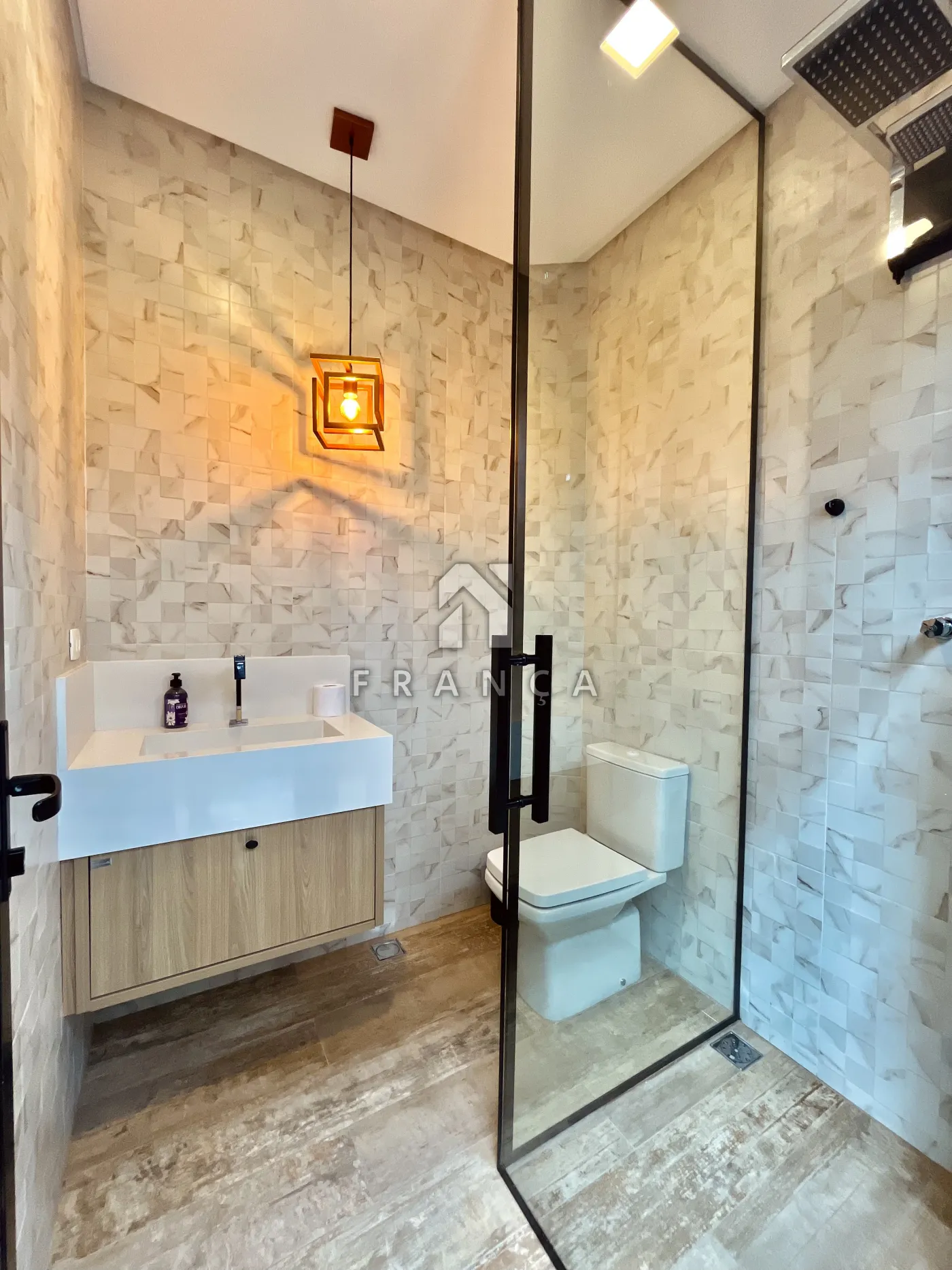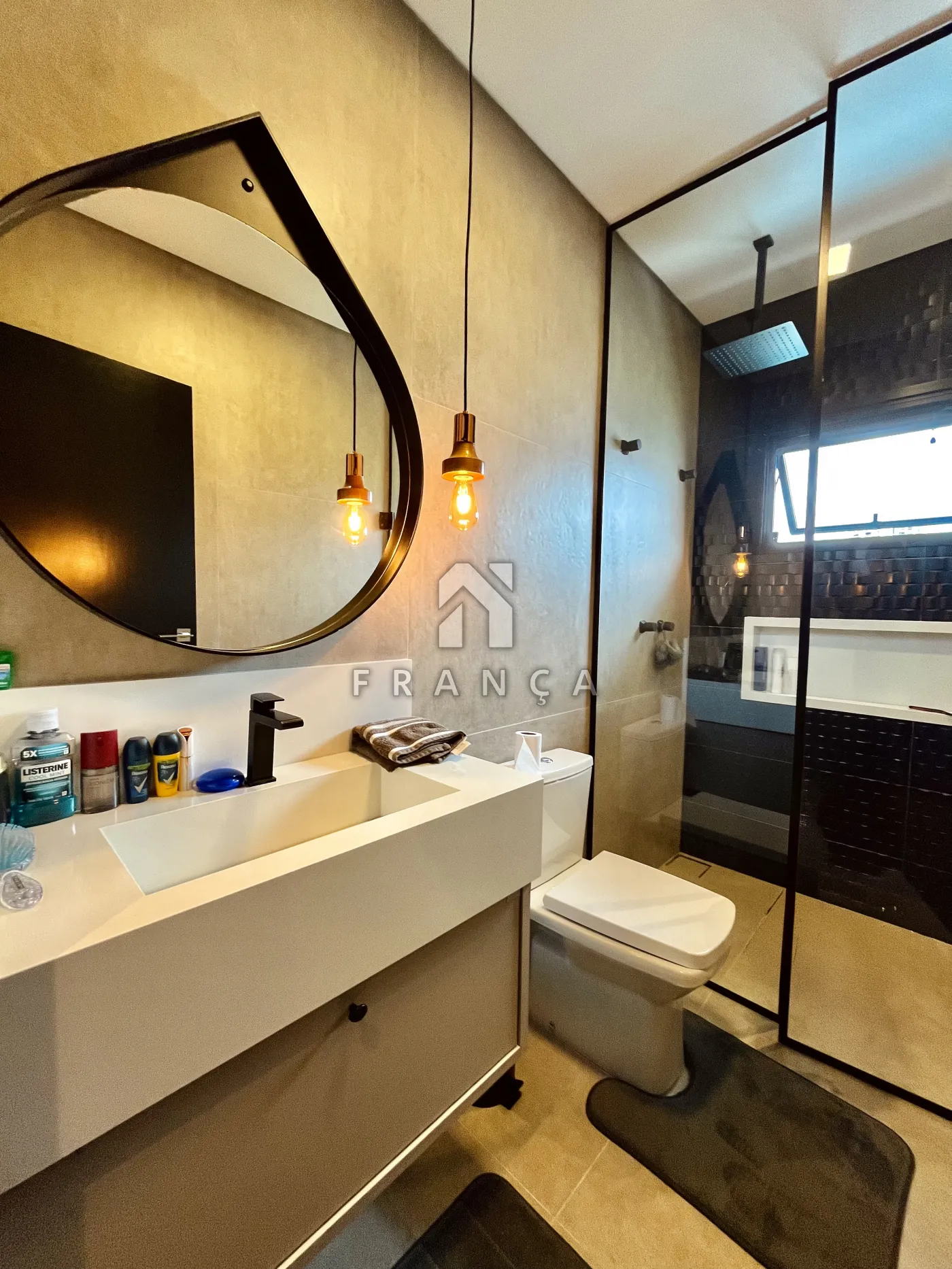 - Sala de TV: Painel planejado exclusivo e lustre central, com lavabo de apoio adjacente.