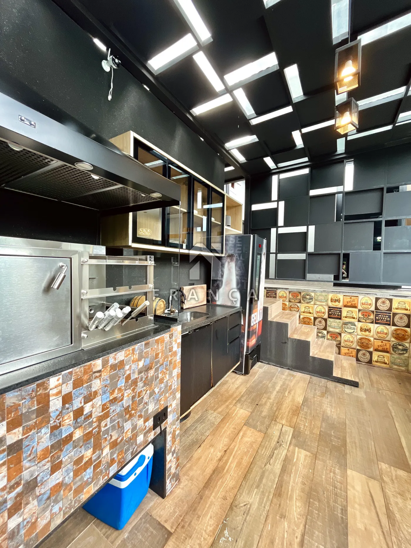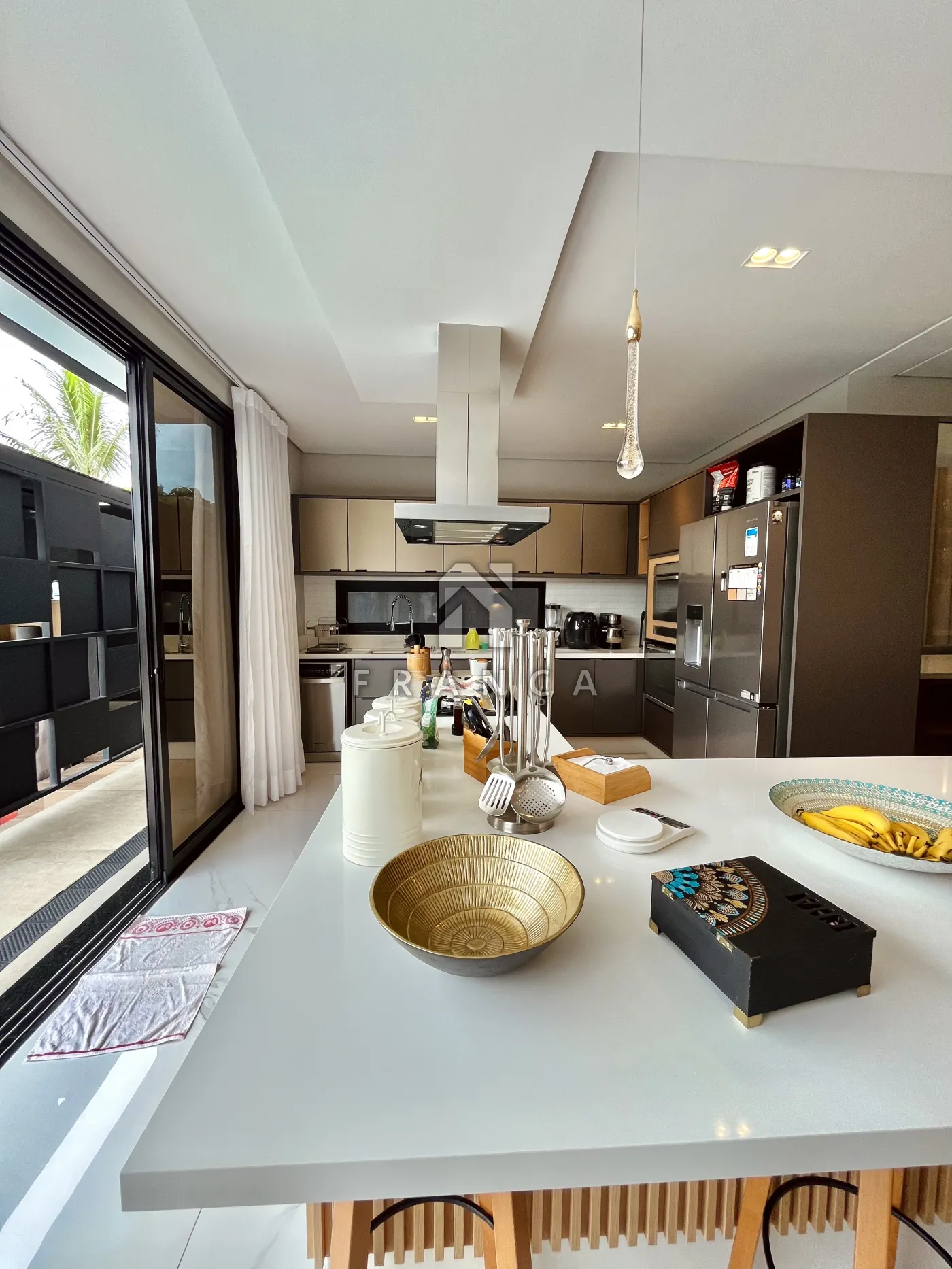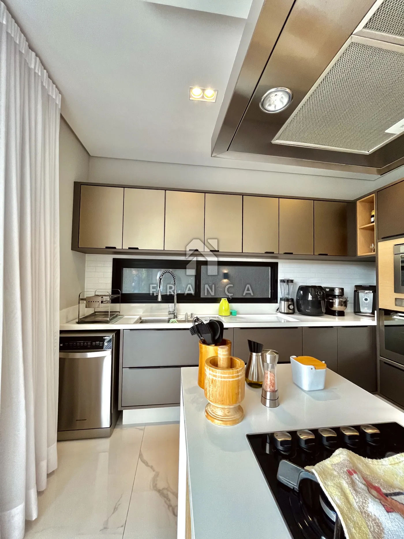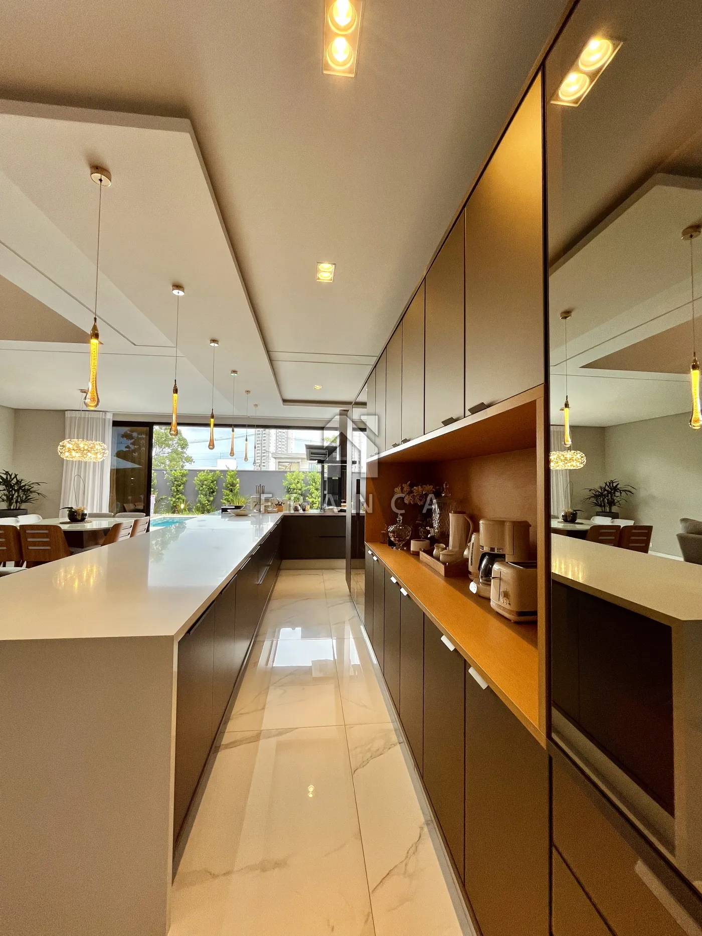 - Armários com vidros reflecta, iluminação interna e eletrodomésticos de embutir (coifa, forno e micro-ondas).