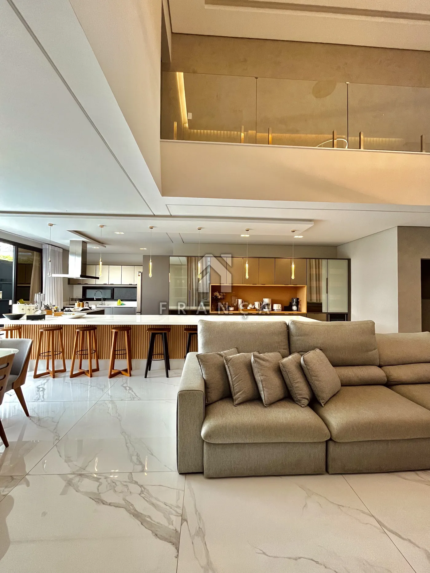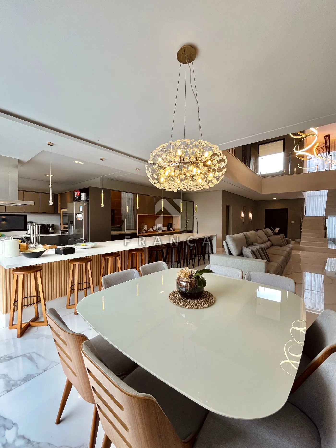 O ambiente social integra sala de TV, jantar e cozinha, criando um espaço fluido e sofisticado.