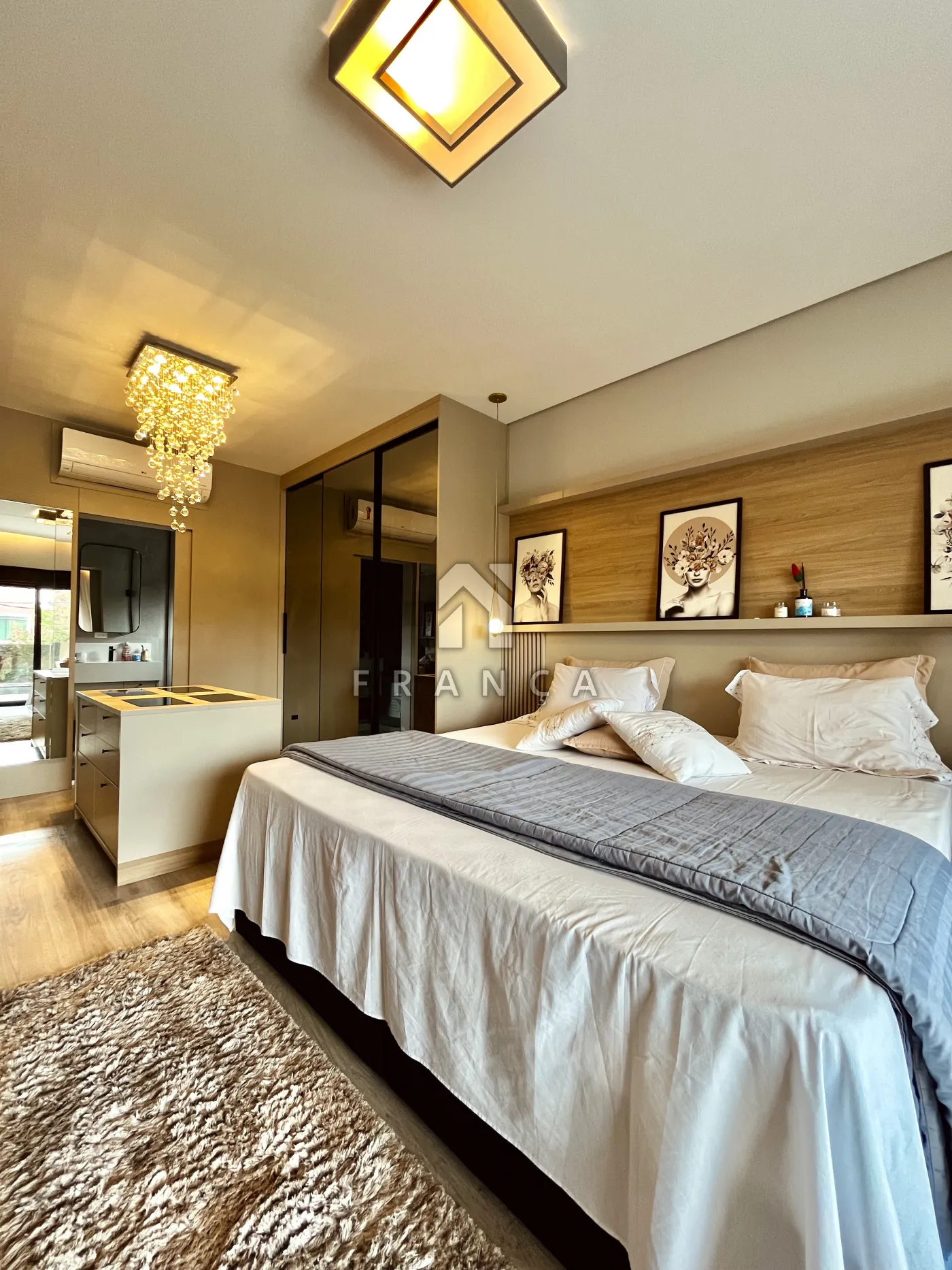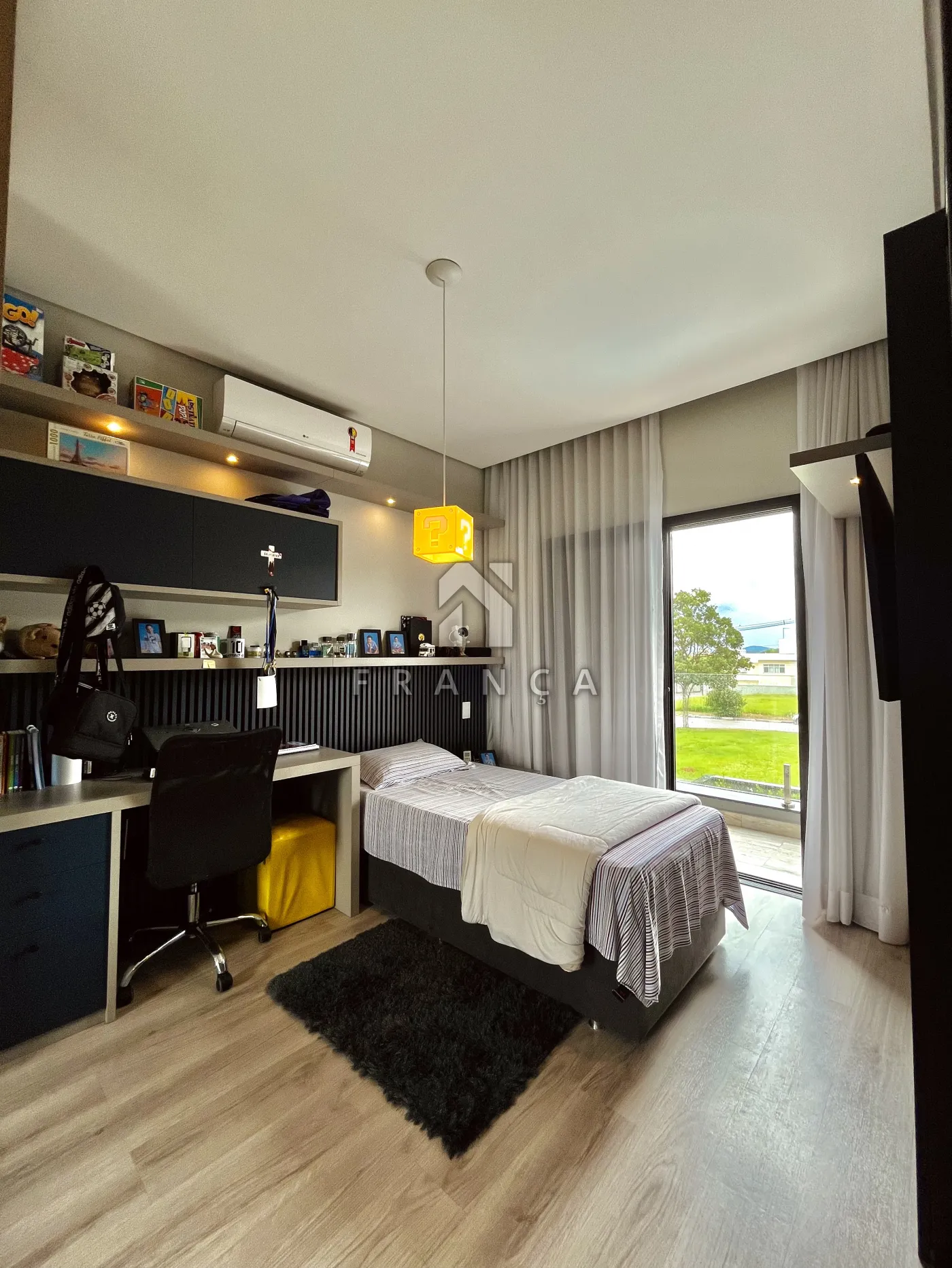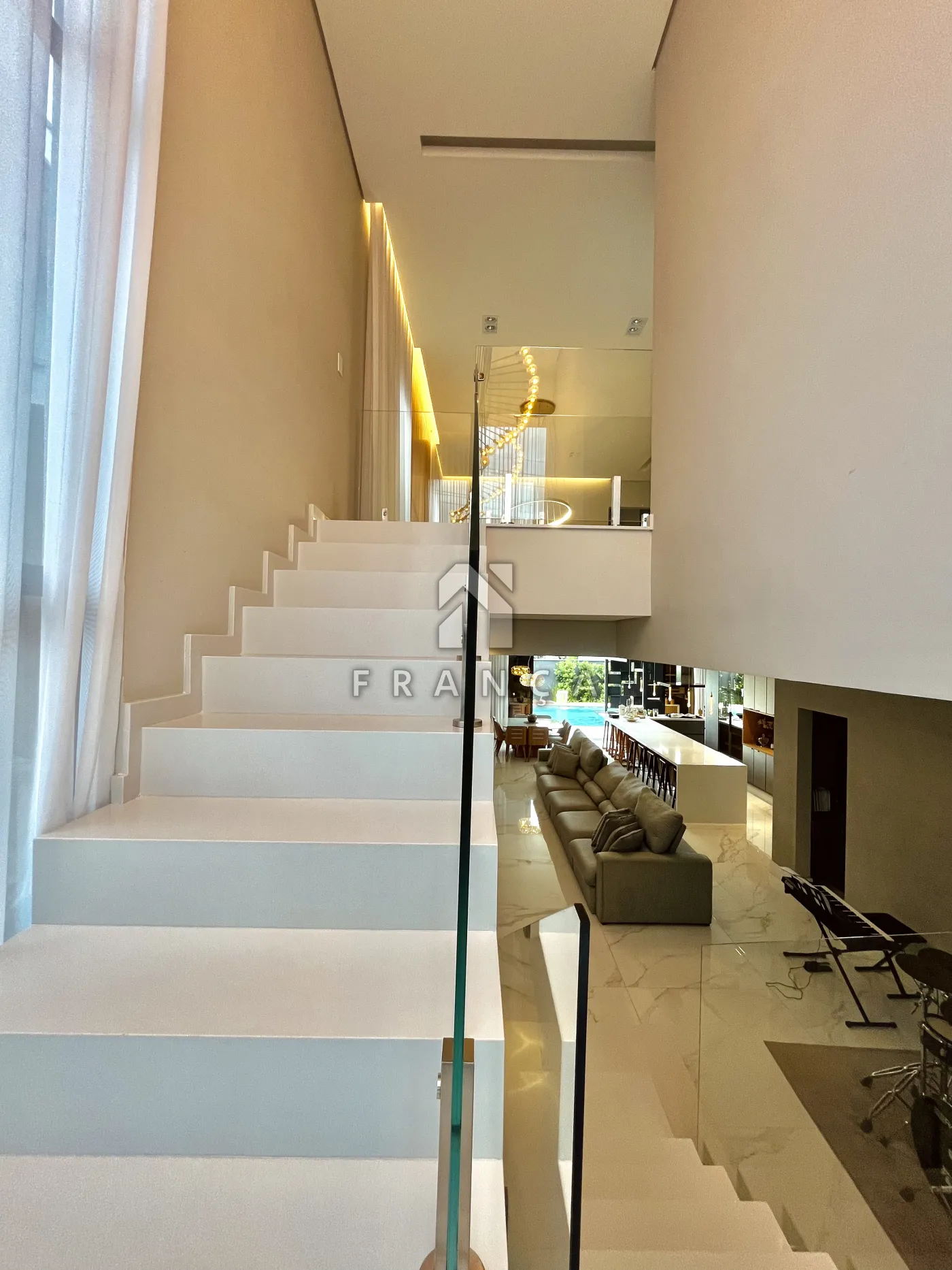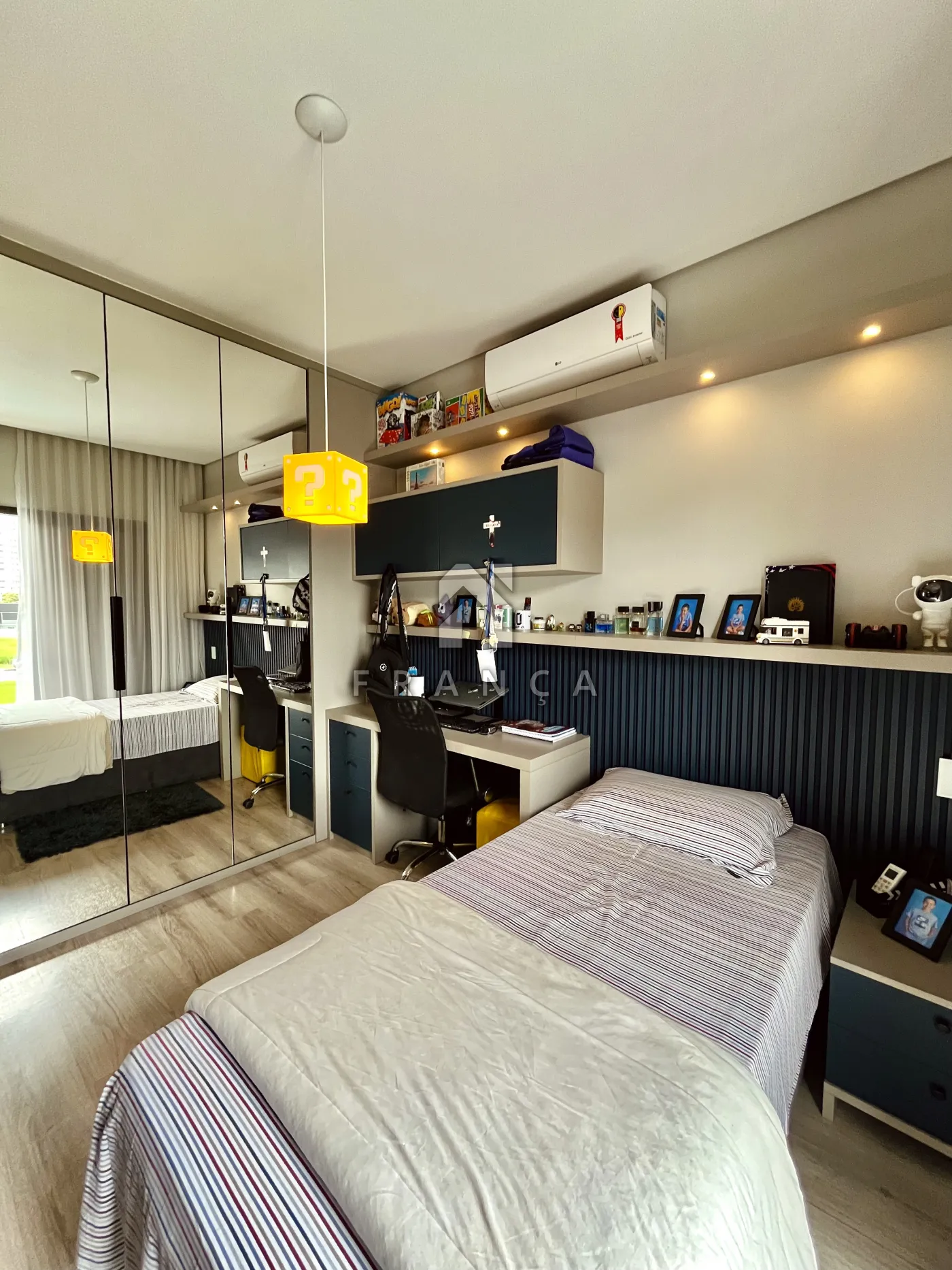 No pavimento superior, a área íntima é composta por 3 suítes, todas equipadas com ar-condicionado e móveis planejados de alto padrão.