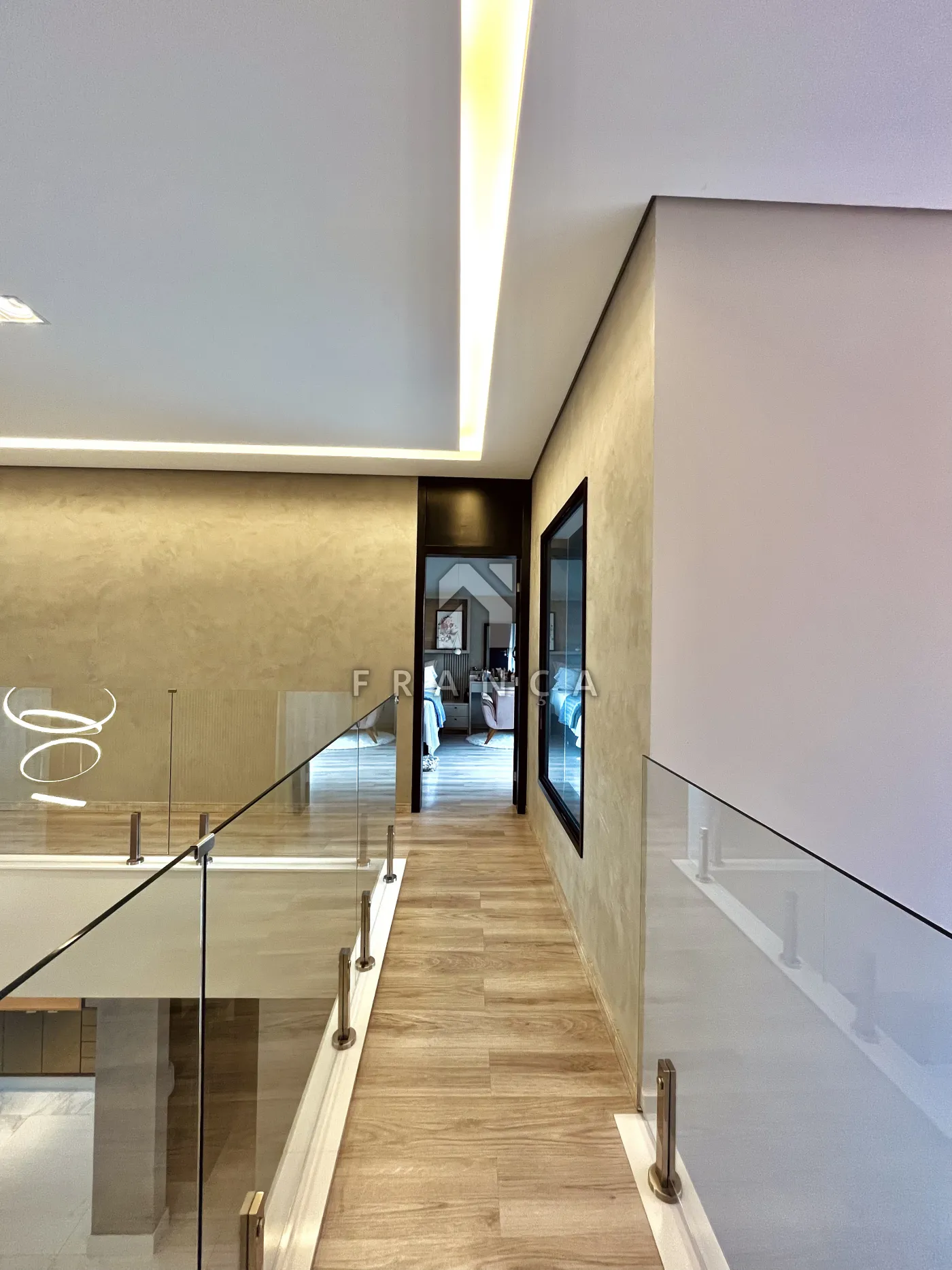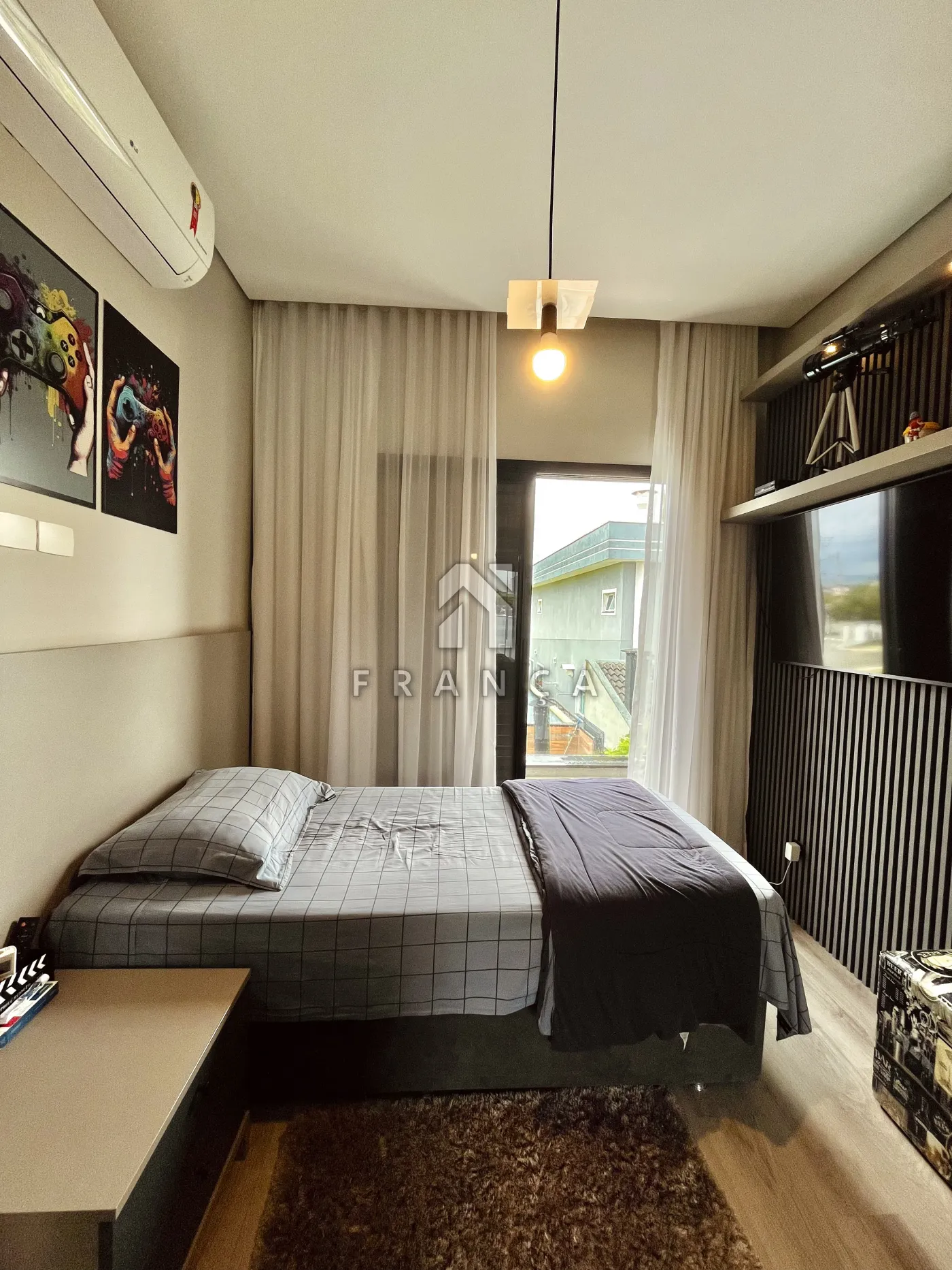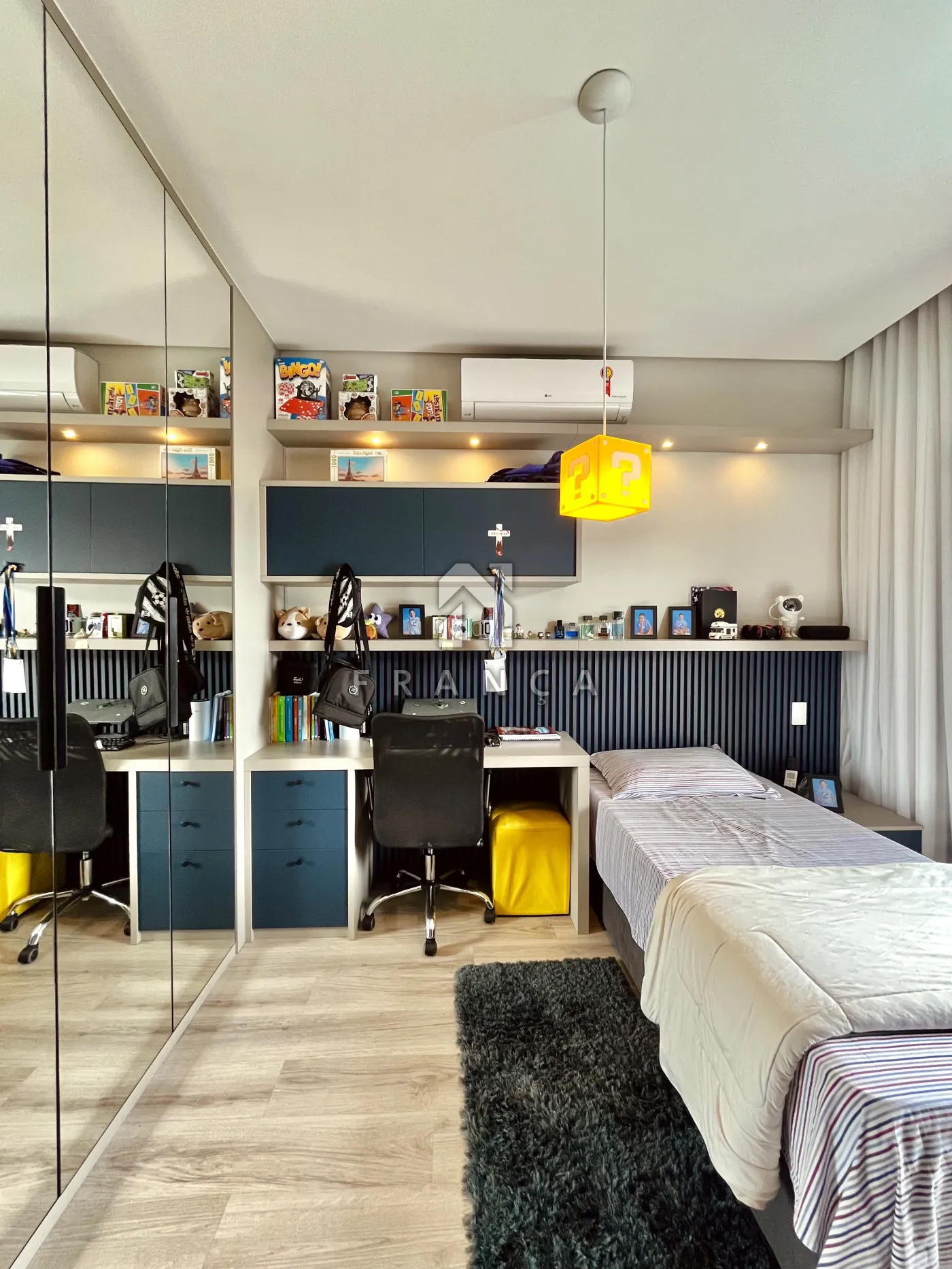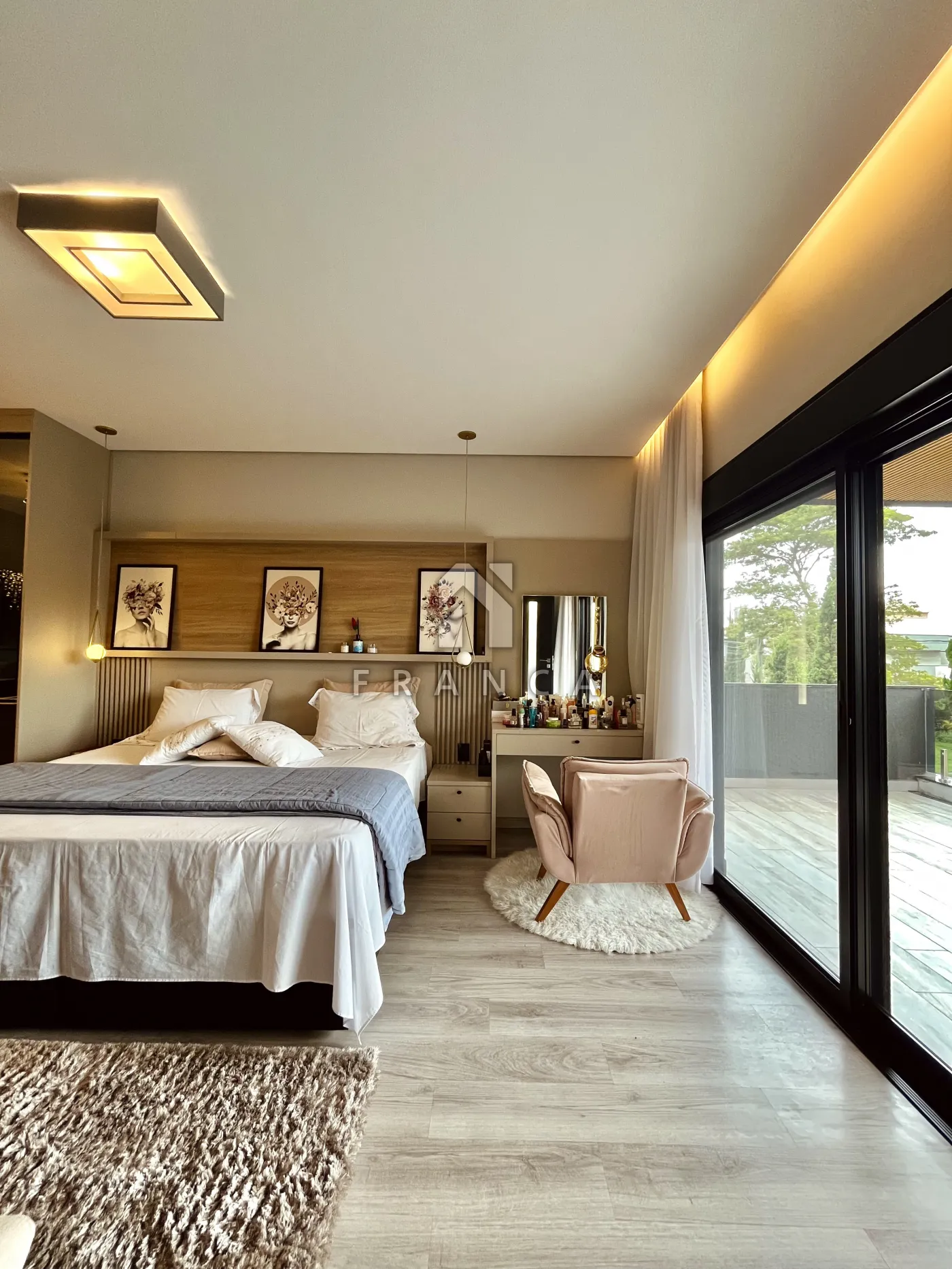 No pavimento superior, a área íntima é composta por 3 suítes, todas equipadas com ar-condicionado e móveis planejados de alto padrão.