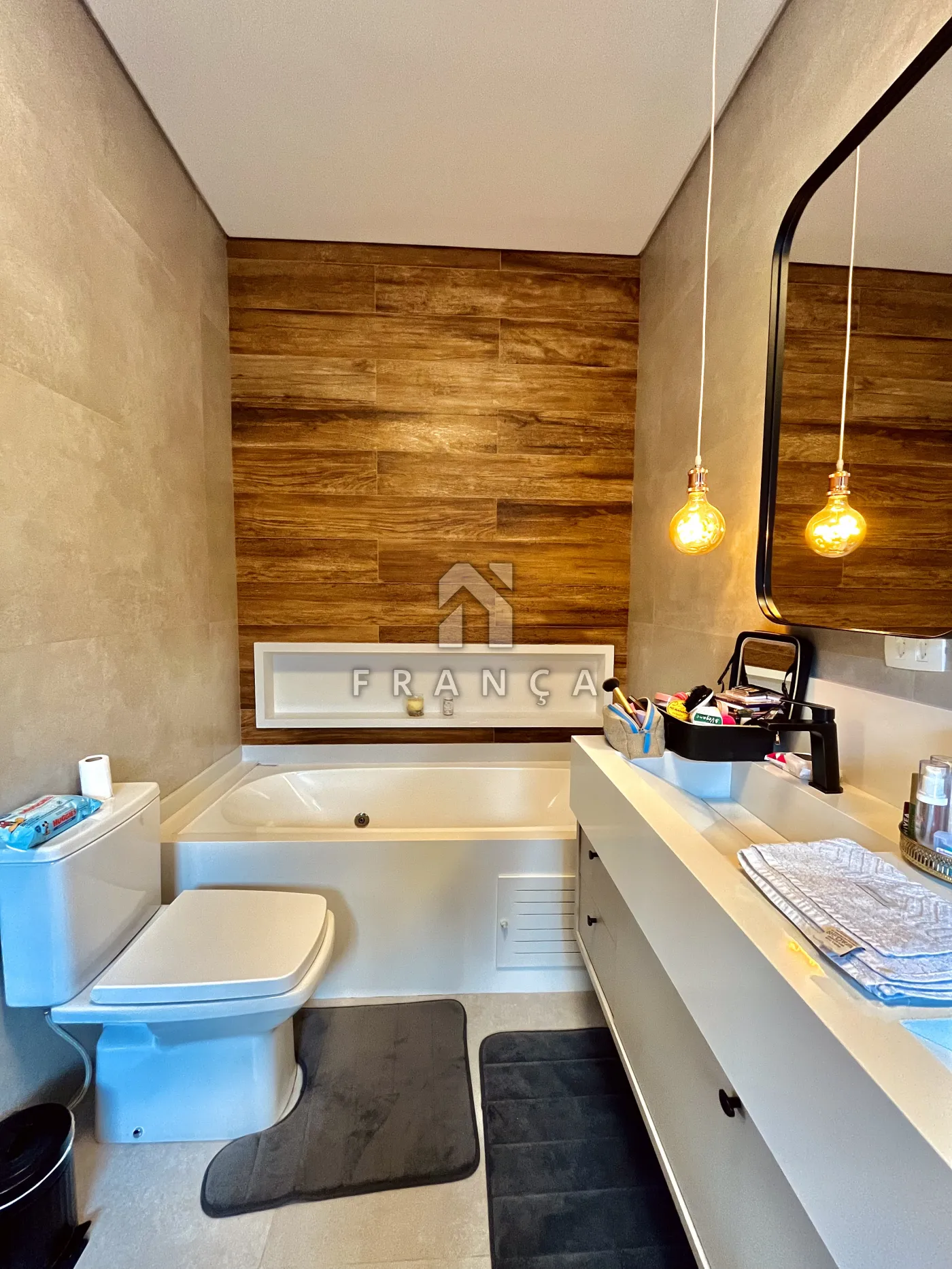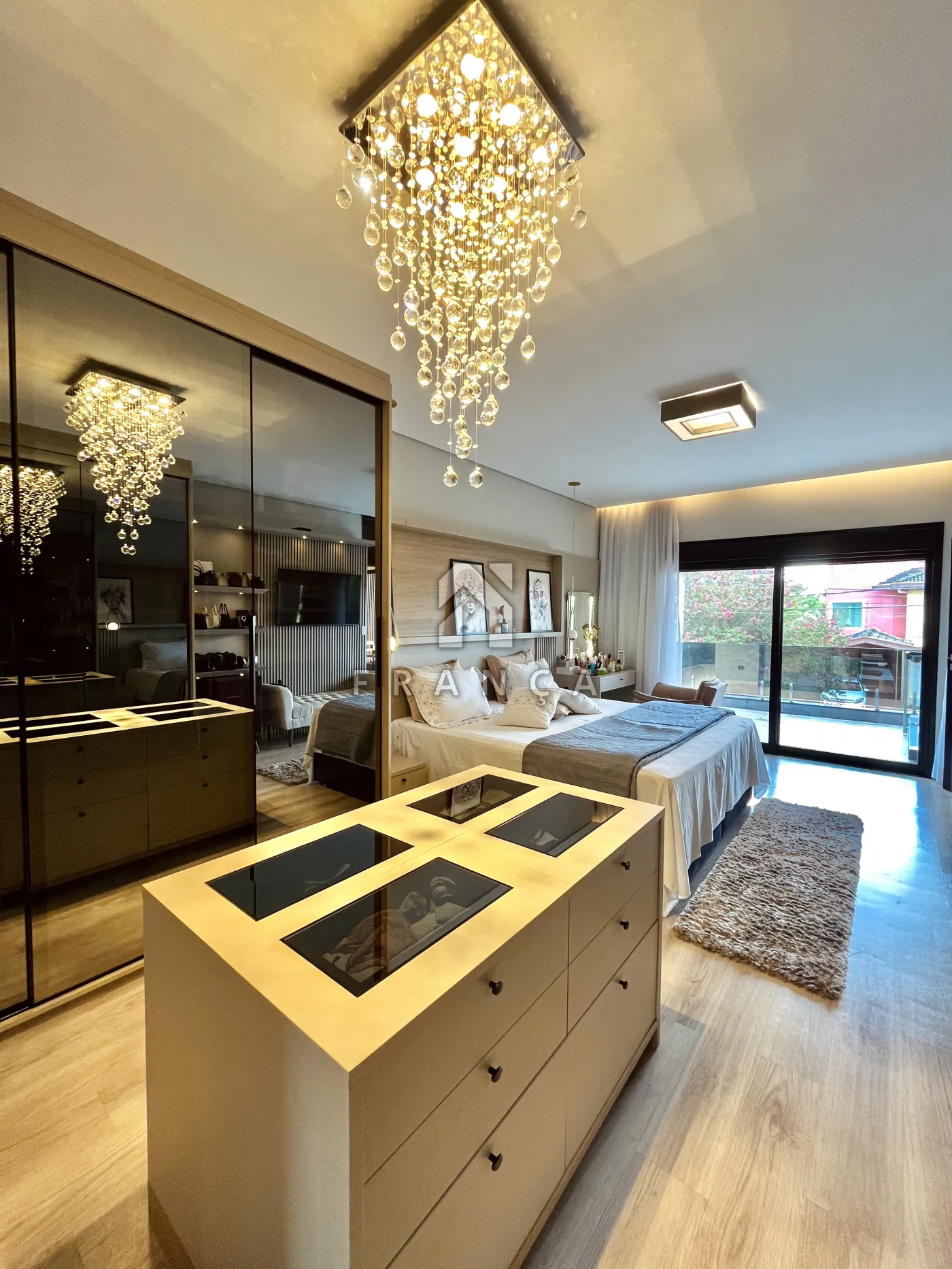 A suíte master é um verdadeiro refúgio, equipada com penteadeira, painel de TV, armários em vidro reflecta, cômoda ilha e um lustre elegante. O banheiro da master oferece bancada dupla, chuveiro a gás e banheira, além de uma varanda privativa com vista para o condomínio.