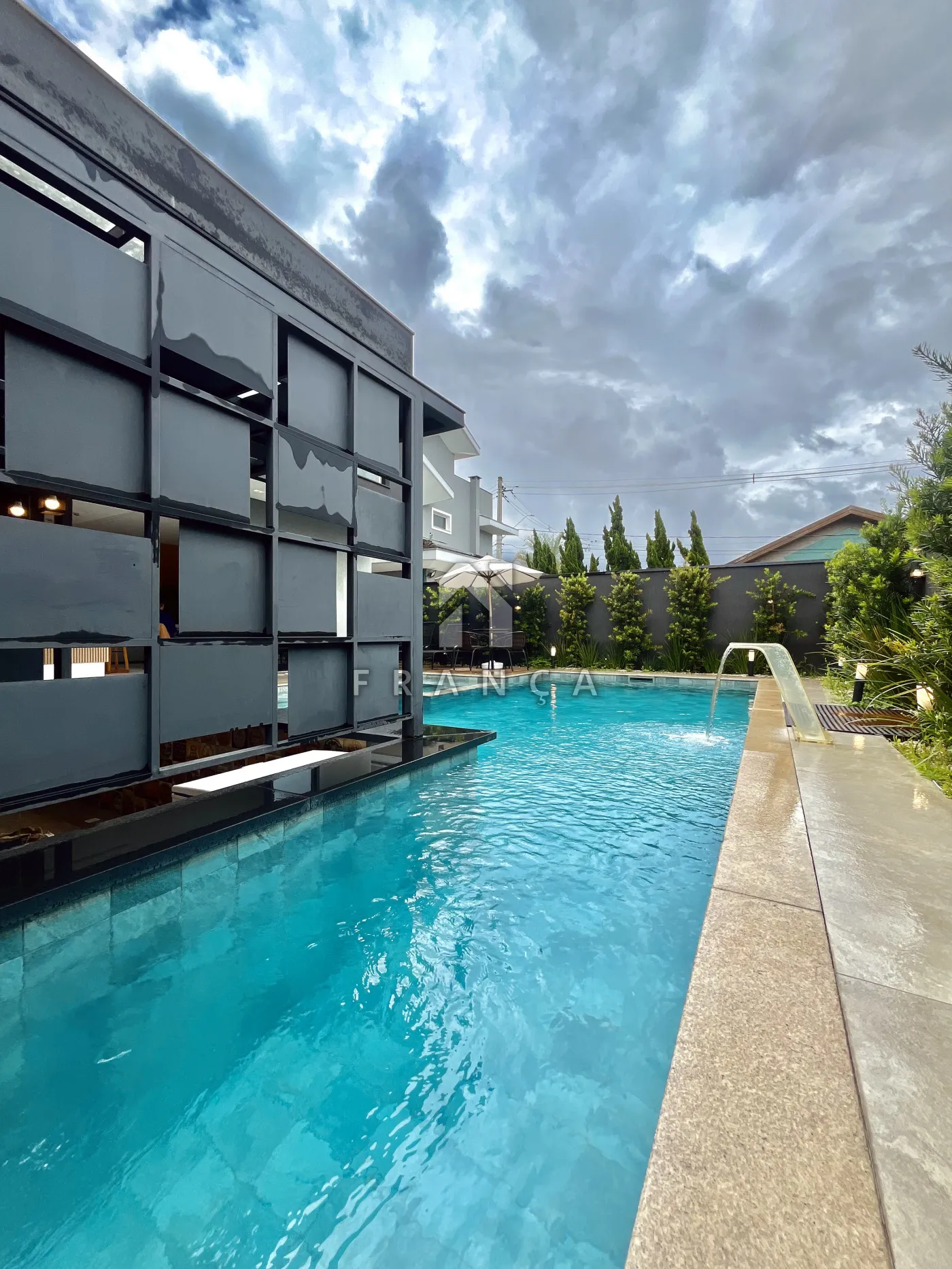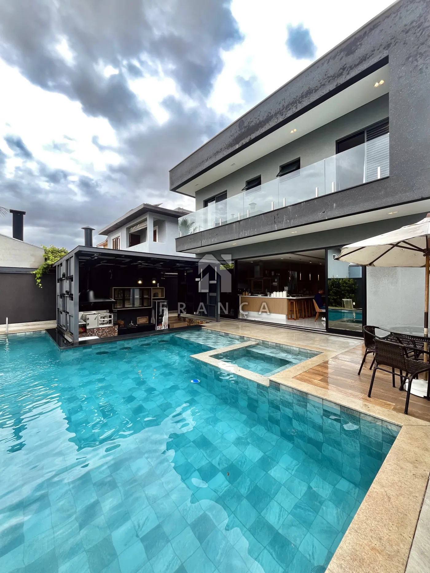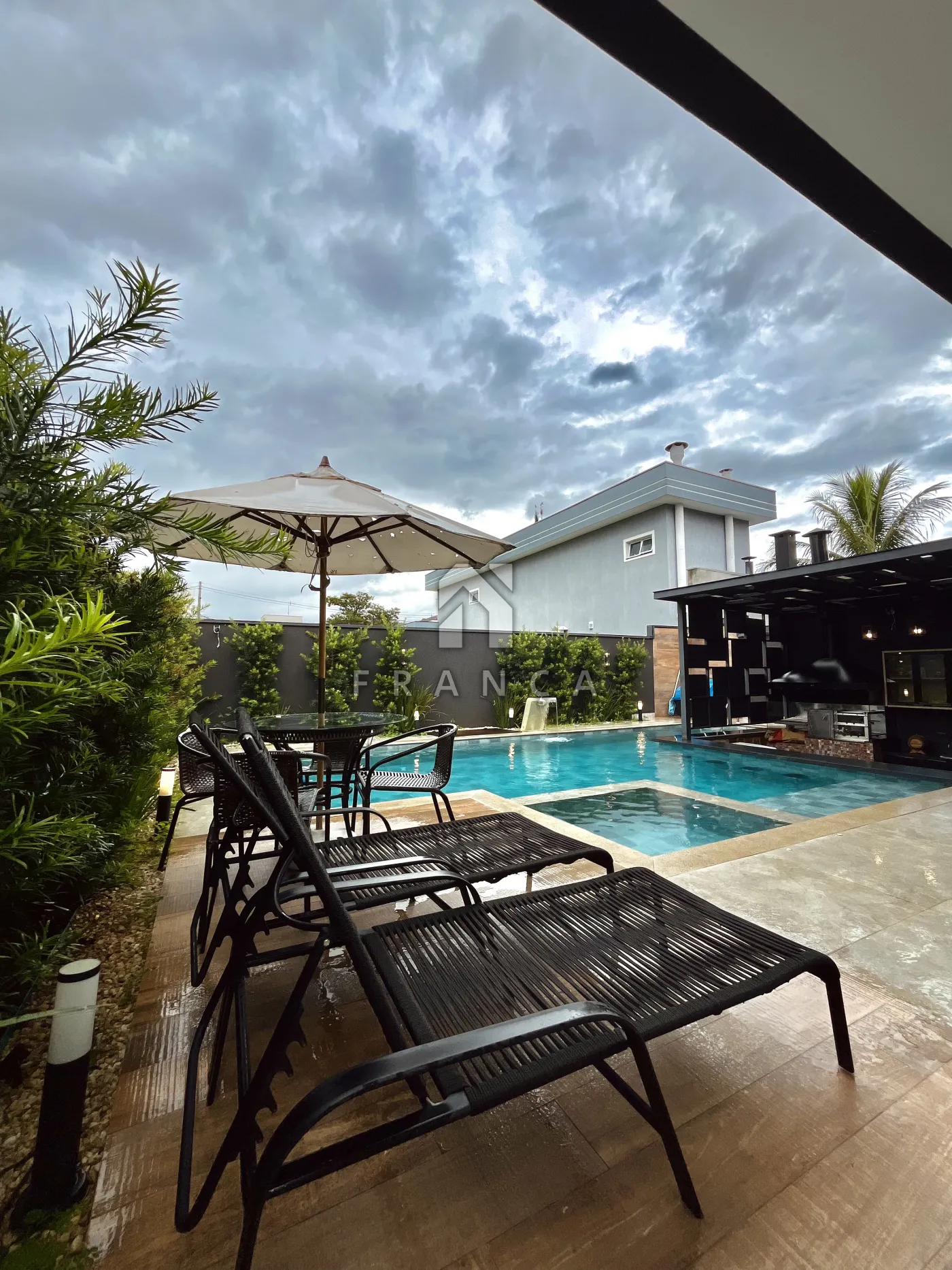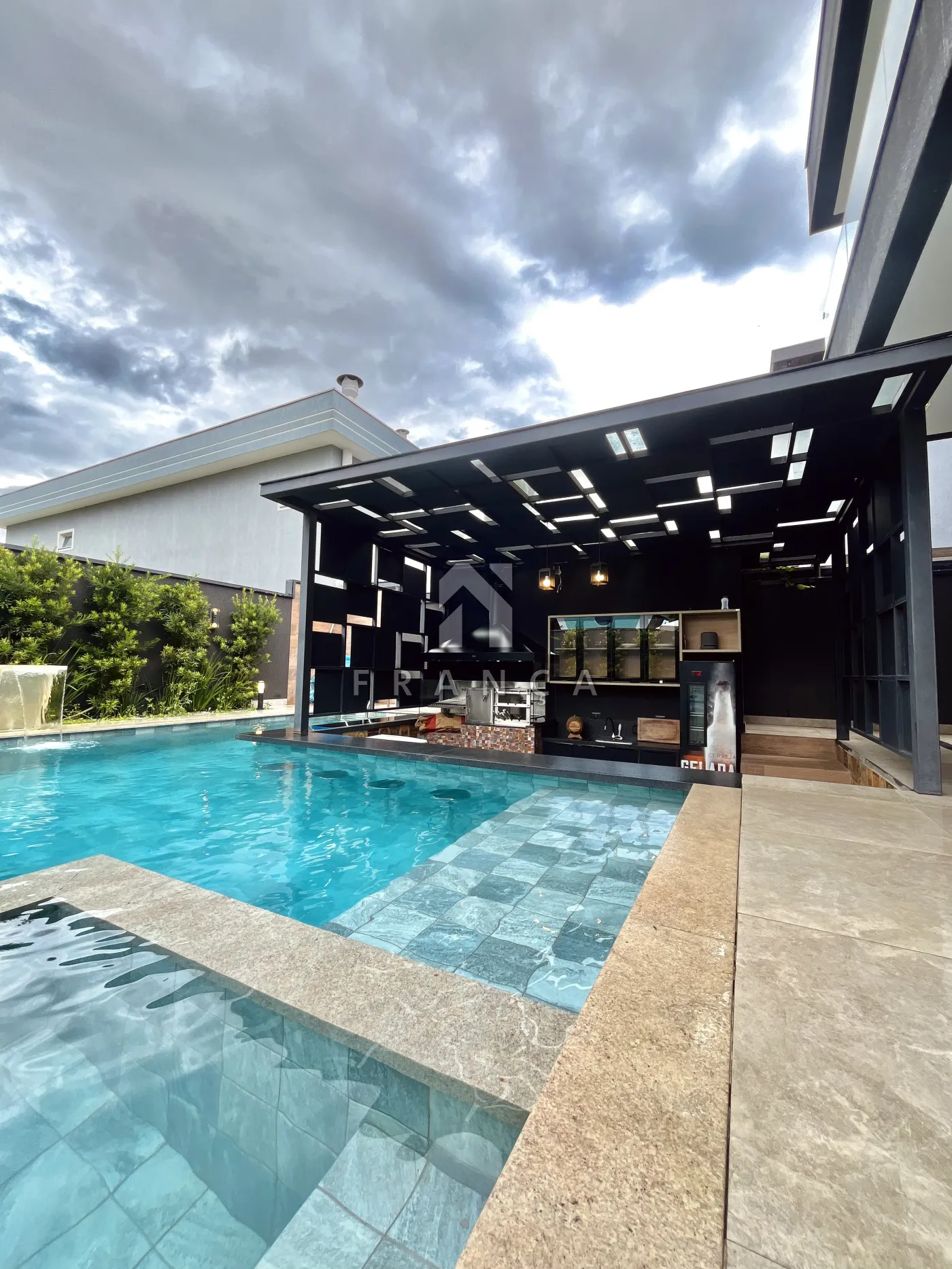 O imóvel conta também com piscina com ilha, cascata e bar molhado. Banheiro externo completo (com chuveiro) e lavanderia coberta.
