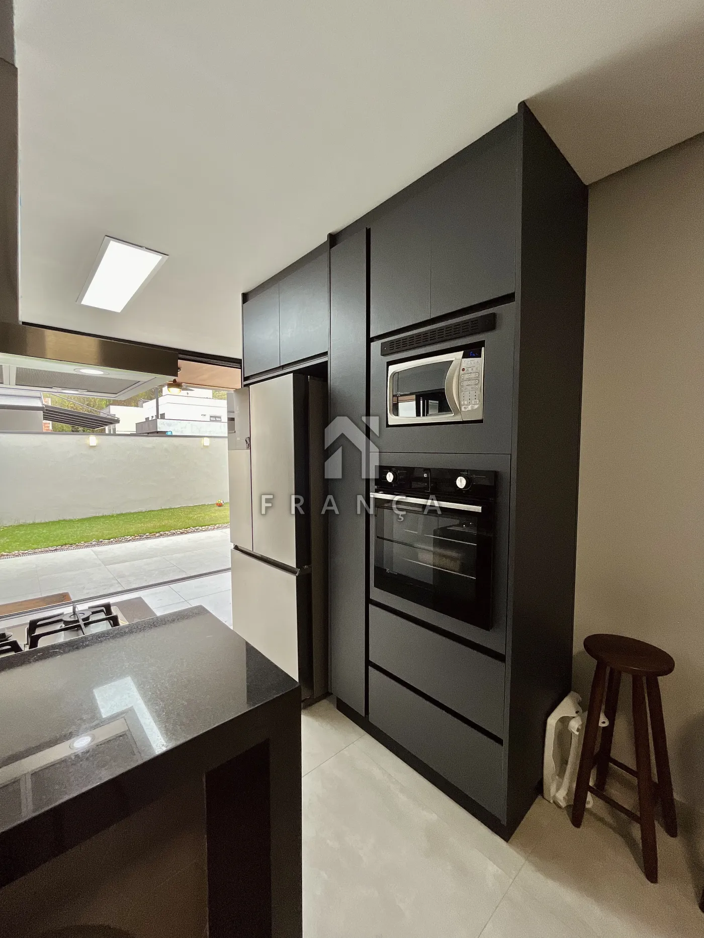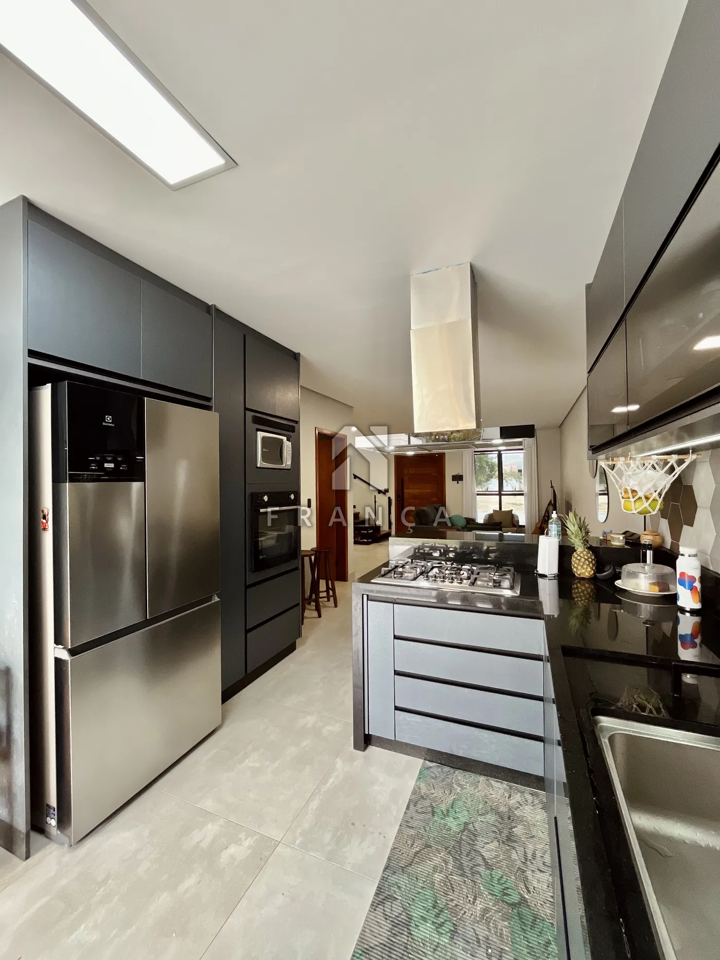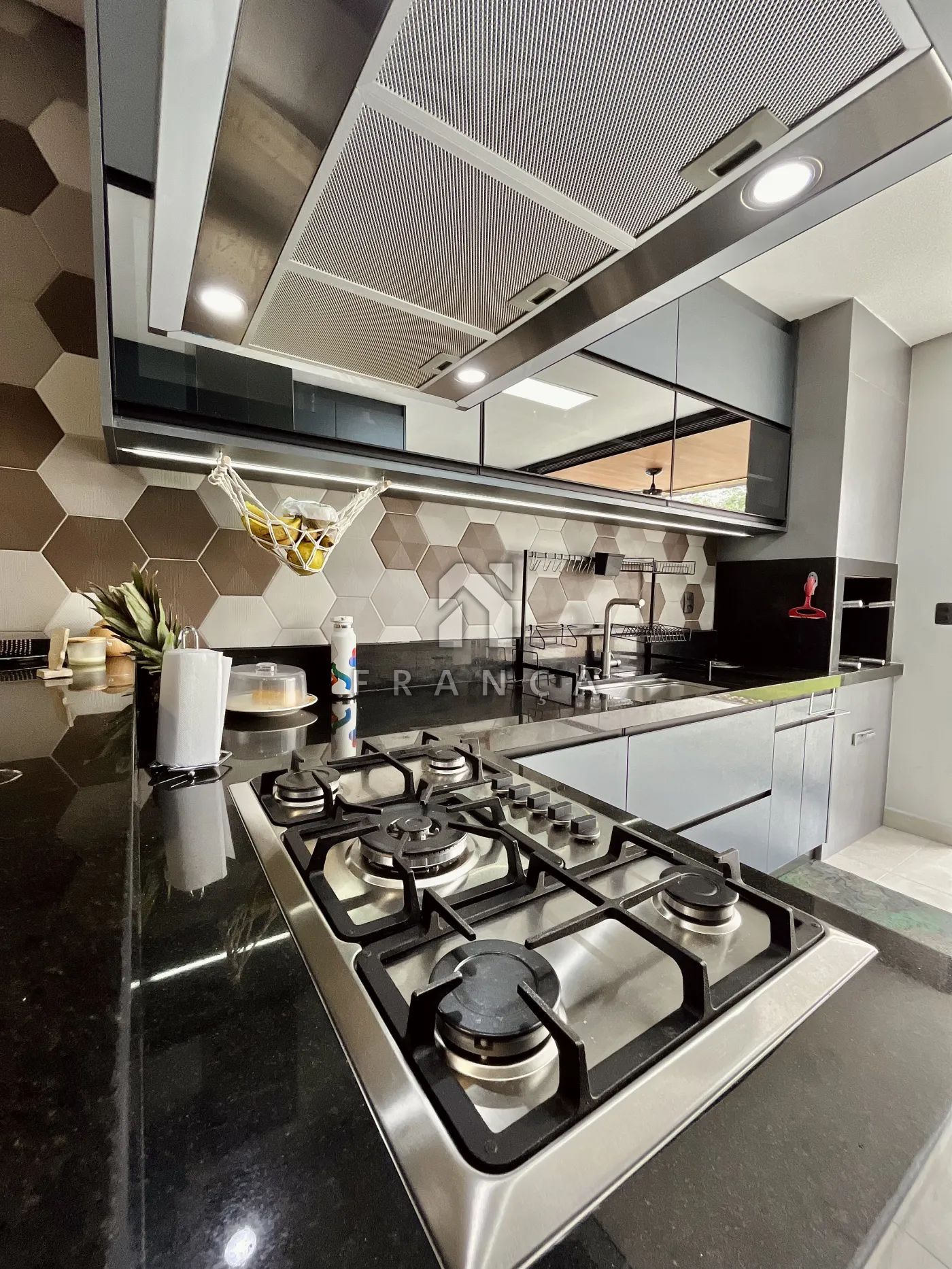 - Cozinha com planejados, forno embutido, cooktop e coifa de teto