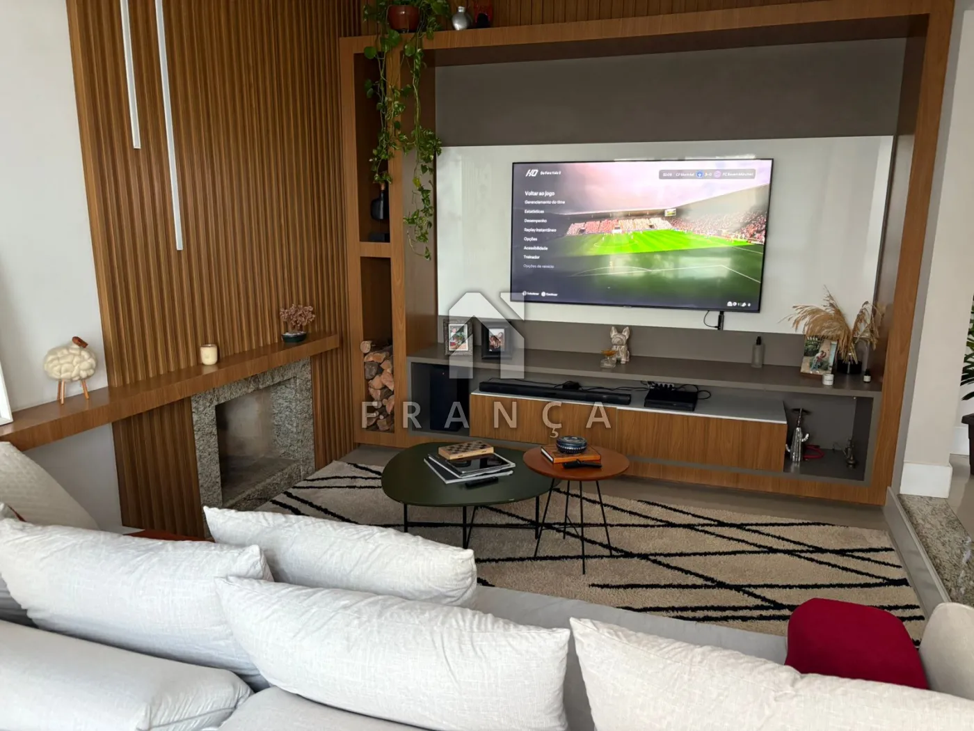 Sala ampla e aconchegante com lareira