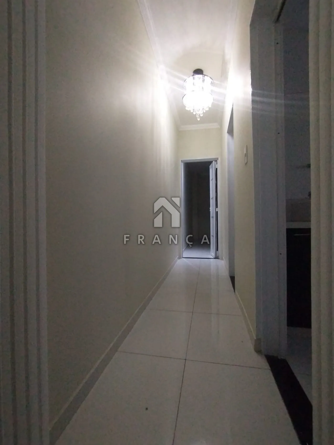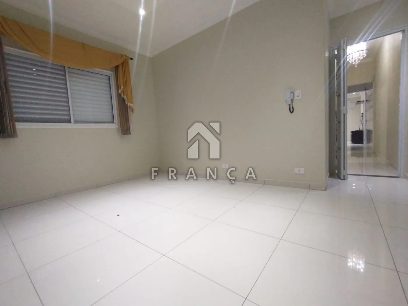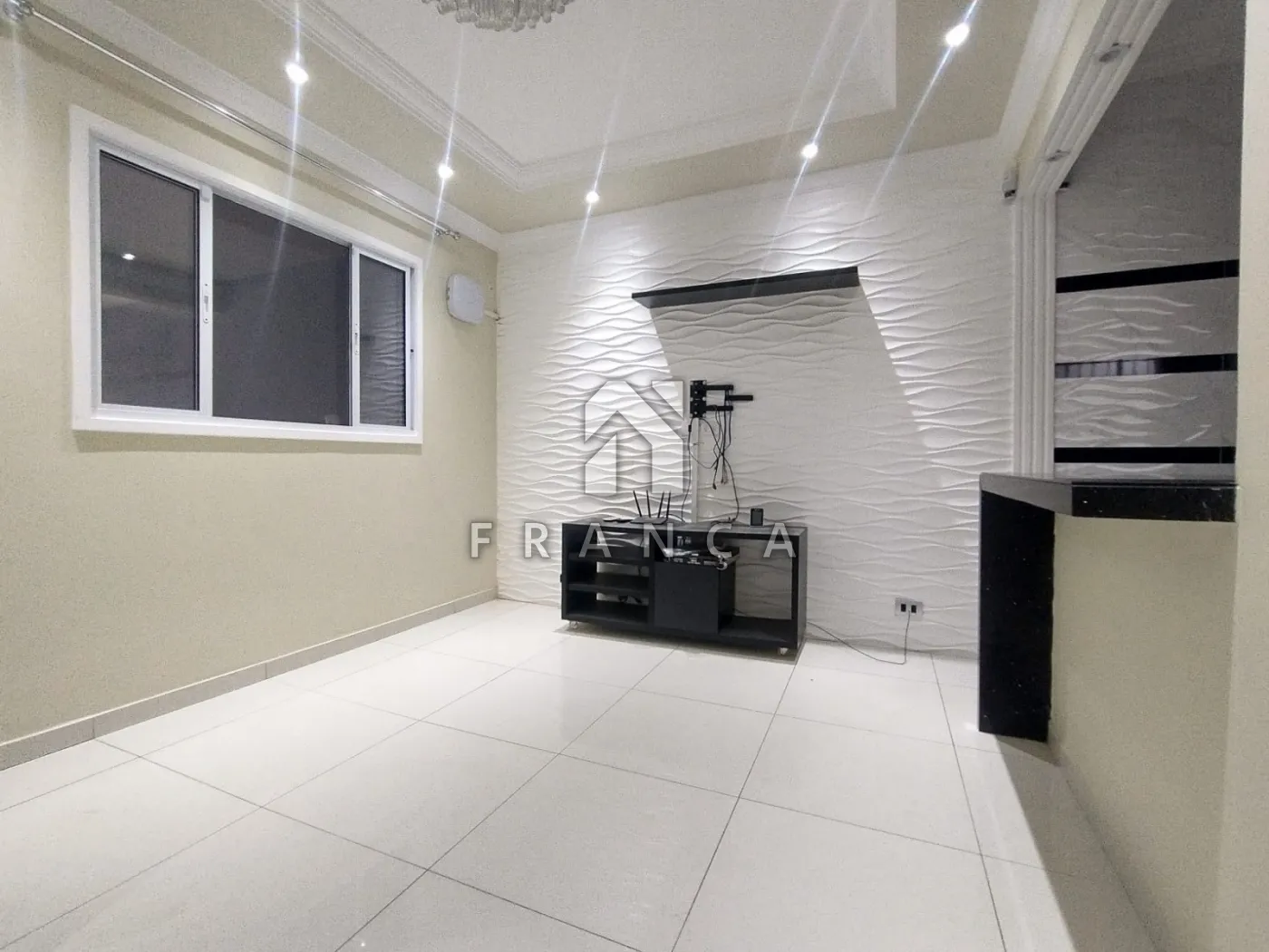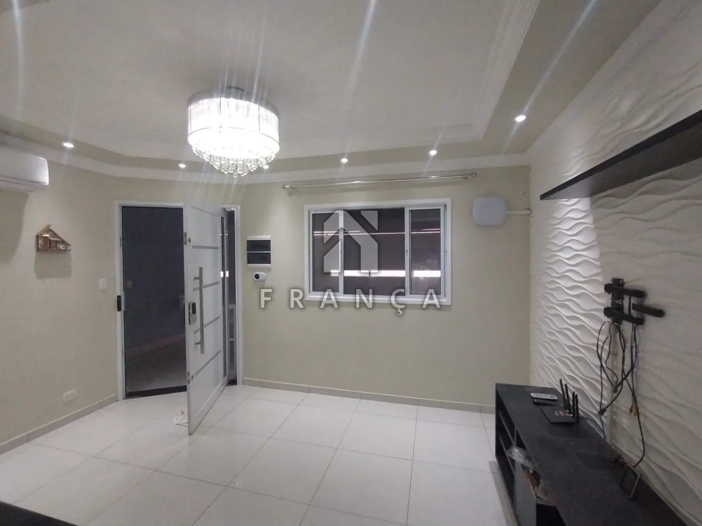 Sala: porta em alumínio branco 1,20m de largura, acabamento com sanca e mosaico 3D, rack mdf, ar condicionado, fechadura eletrônica com senha digital, alarme residencial intelbras, lustre cristal, janela alumínio branco com tela mosquiteiro.