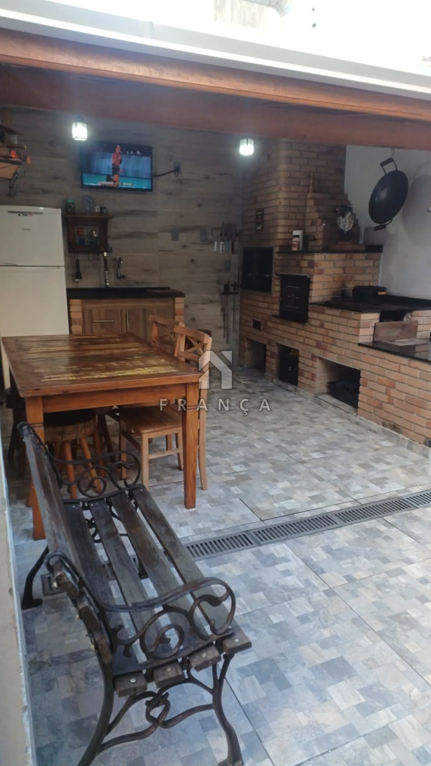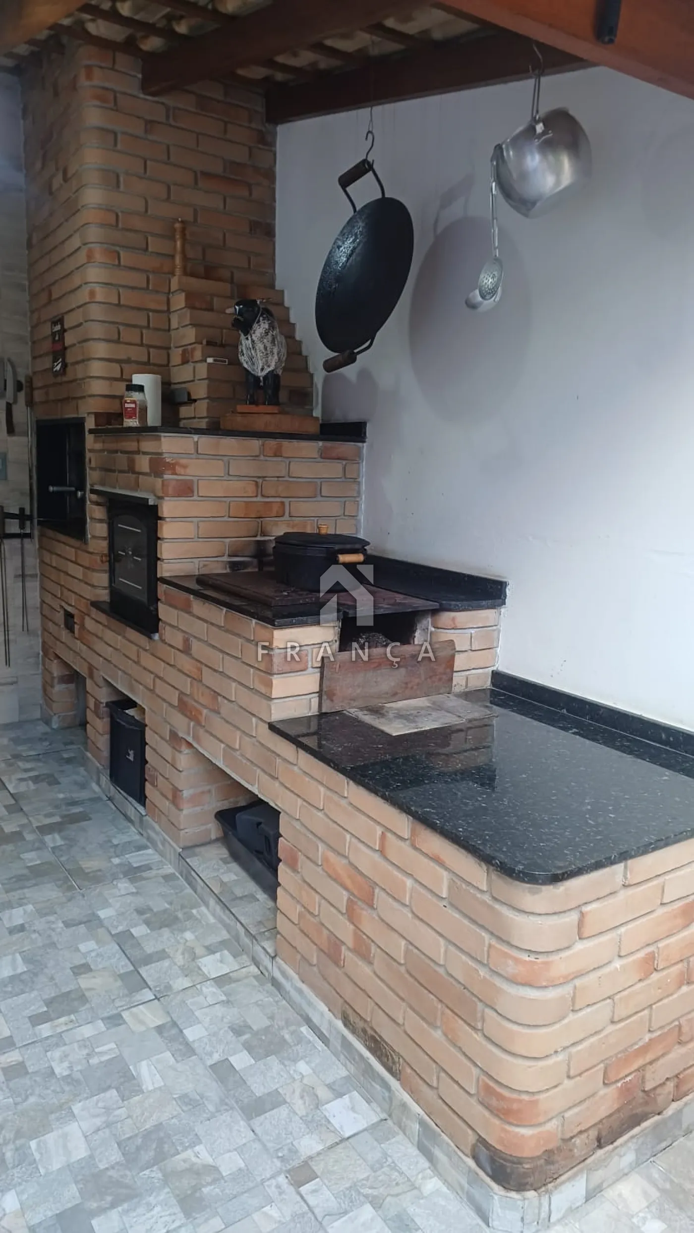 Pia, churrasqueira, forno de pizza e fogão à lenha