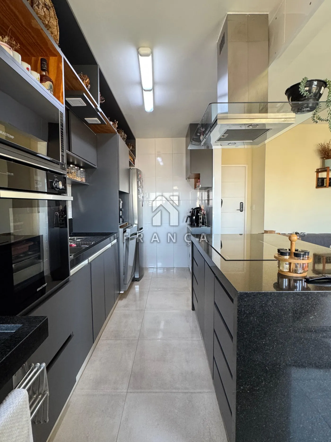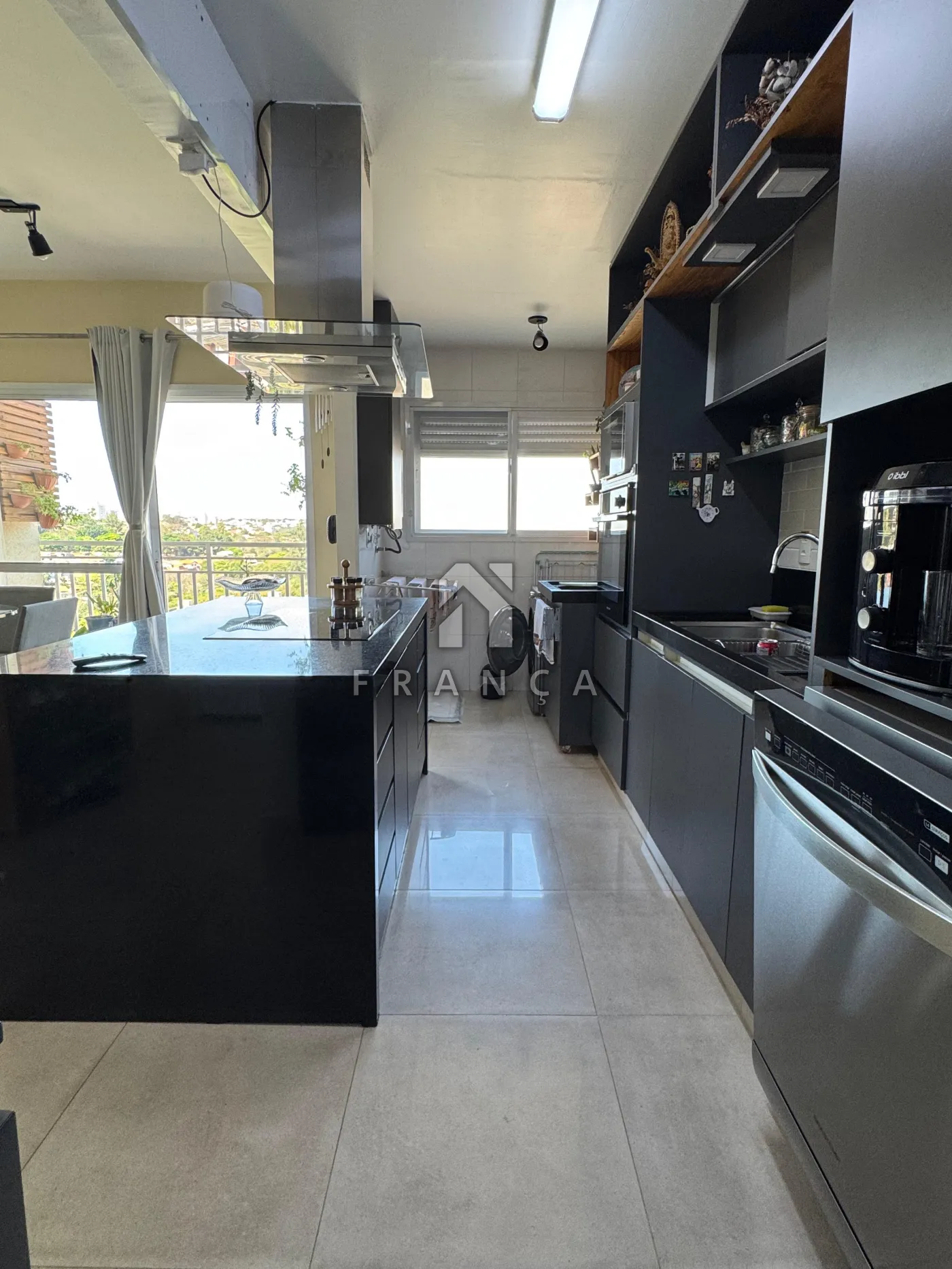 Cozinha completa com coifa, cooktop de indução, micro-ondas, forno e lava-louças